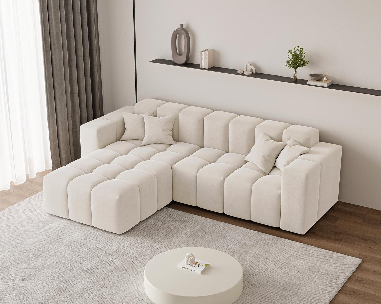 Tkanina Komodo to połączenie miękkości i trwałości. Jej gęsta struktura i delikatny połysk dodają narożnikowi elegancji, a kremowy kolor sprawia, że wnętrze staje się jasne, przytulne i pełne harmonii.