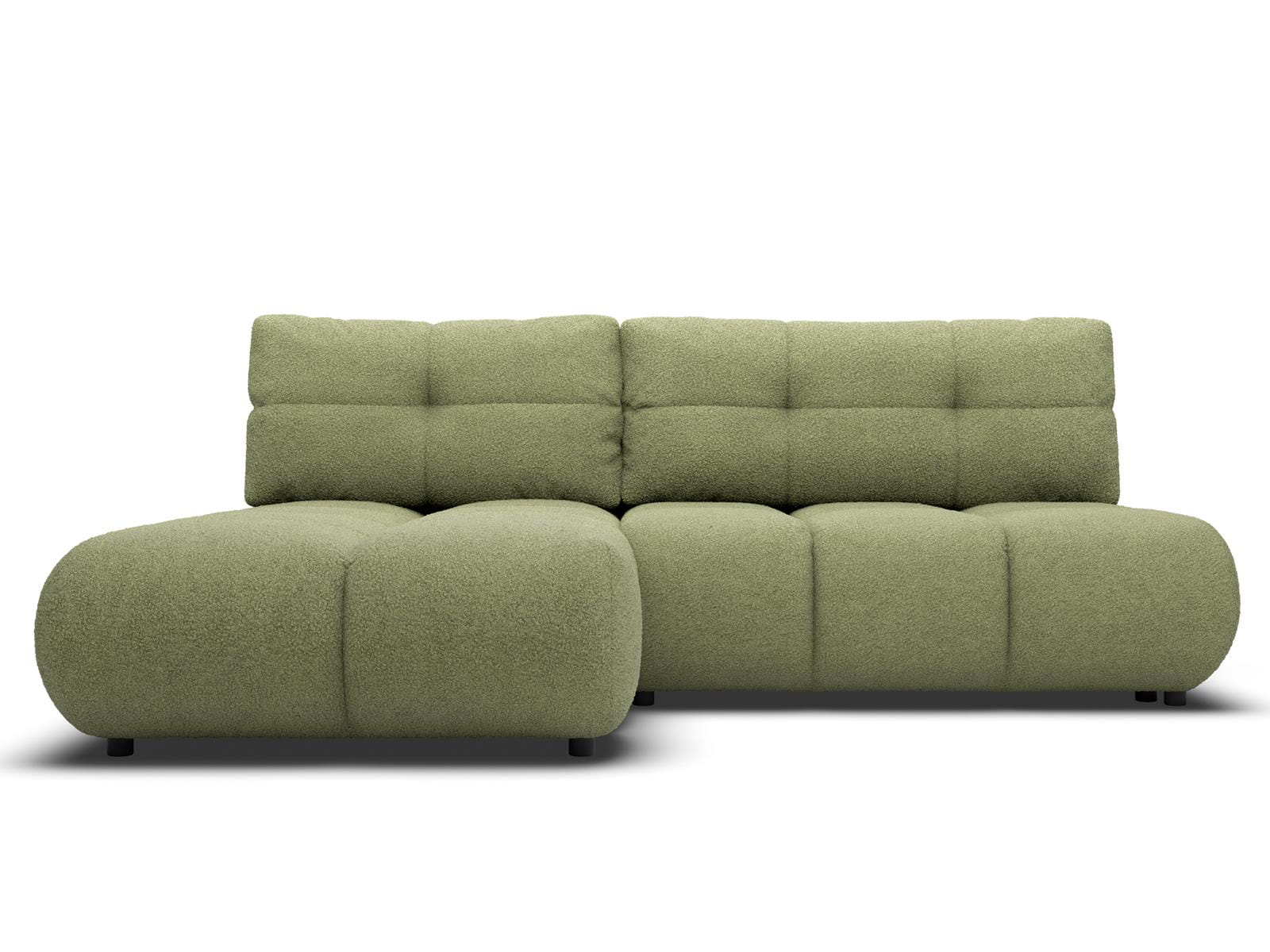 Ten narożnik w oliwkowej tkaninie boucle to propozycja dla osób poszukujących mebla, który połączy nowoczesną formę, wygodę i elegancję w jednym.
