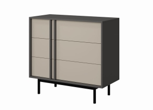 Trzy pojemne szuflady oferują wystarczająco dużo miejsca na ubrania, akcesoria, dokumenty czy tekstylia, a wysokie, czarne nogi podkreślają nowoczesny charakter mebla i zapewniają wygodę użytkowania.