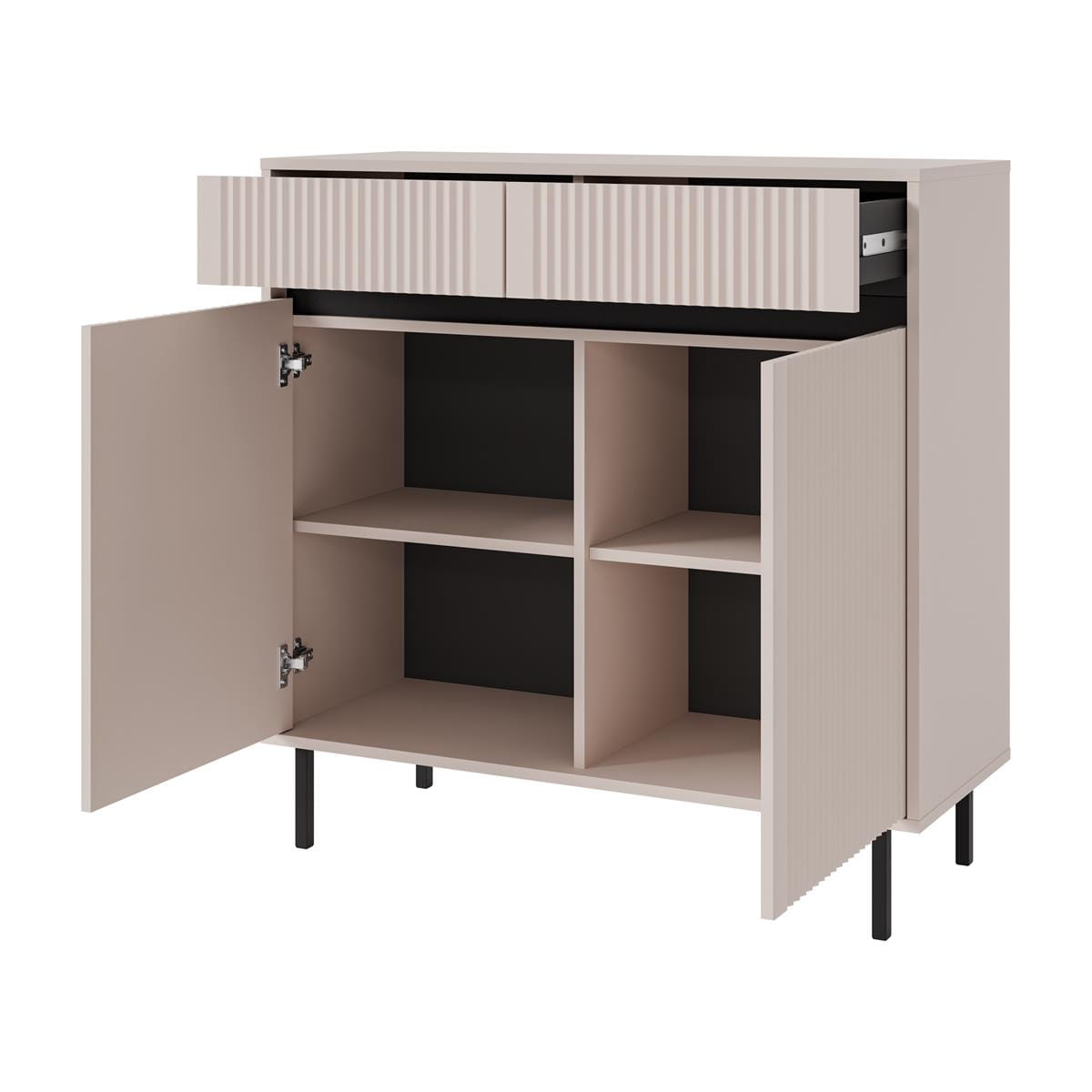 Front komody zdobi dekoracyjne, pionowe ryflowanie, które wprowadza delikatną strukturę i przyciąga wzrok ciekawą grą światła. Ten modny detal nadaje meblowi nowoczesnego wyrazu, jednocześnie zachowując jego ponadczasową, stonowaną estetykę.
