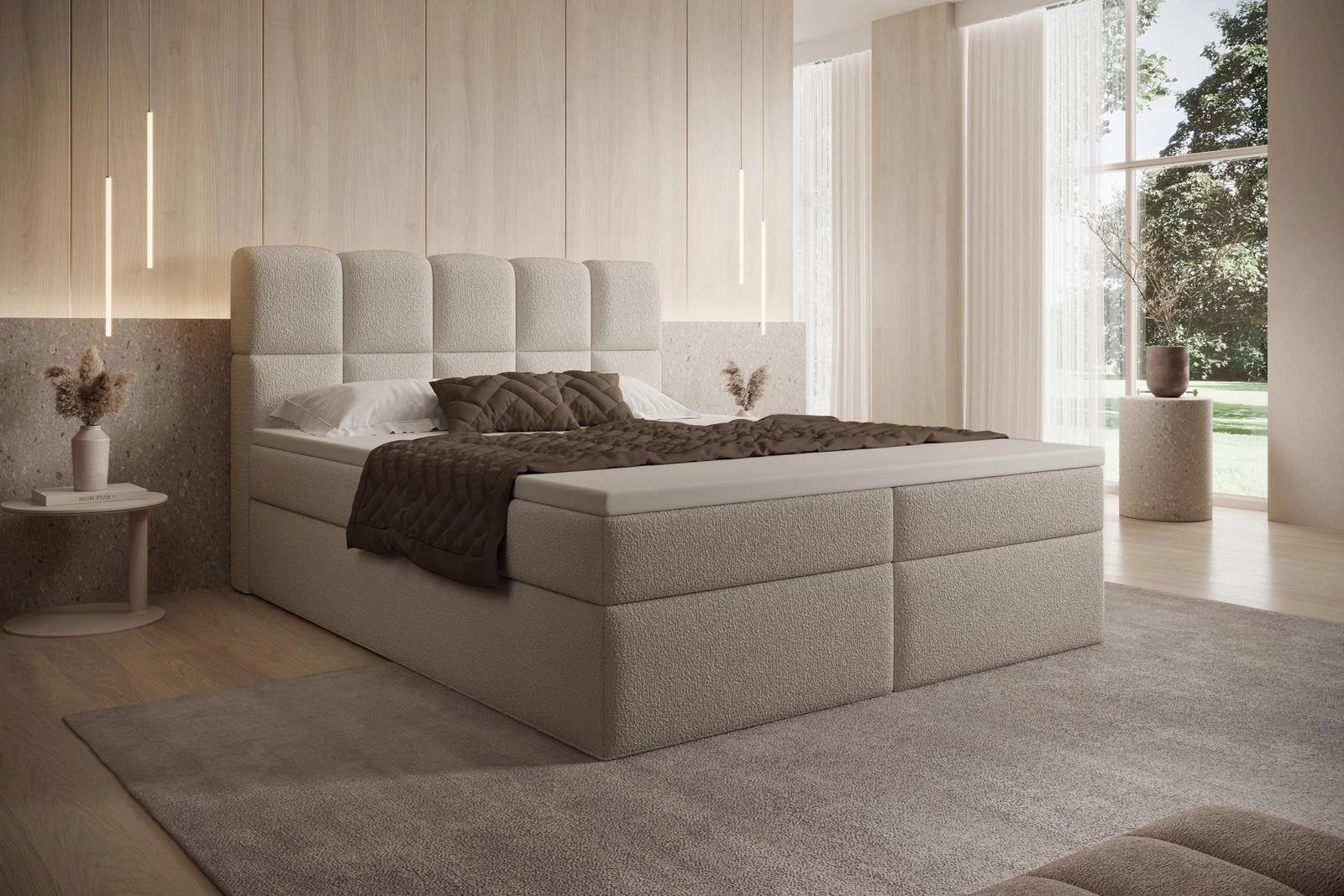 Beżowe łóżko kontynentalne z materacem i wysokim zagłówkiem PALEO