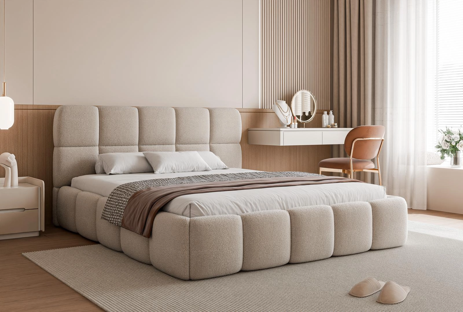 Beżowe łóżko to idealne połączenie nowoczesnego designu, wygody i praktycznych rozwiązań. Wyróżnia się solidną konstrukcją oraz starannie wykończonymi liniami, które nadają całości wyjątkowego charakteru. Miękka, przyjemna w dotyku tapicerka w ciepłym, beżowym odcieniu wprowadza do wnętrza przytulność, harmonię i elegancję, doskonale komponując się zarówno z aranżacjami nowoczesnymi, skandynawskimi, jak i klasycznymi.