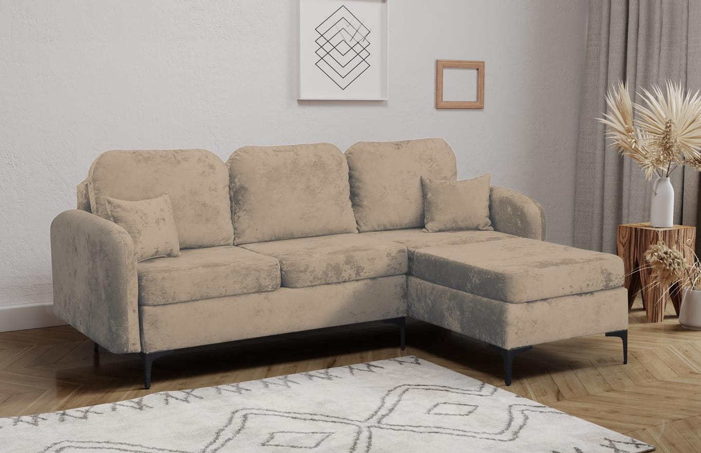 ✔ Luksusowy wygląd – tapicerka z miękkiego, welurowego materiału nadaje narożnikowi elegancji i przyjemnej w dotyku faktury.
