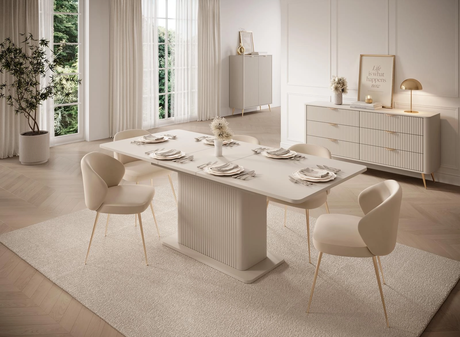 Dzięki swojej neutralnej kolorystyce i eleganckiej formie stół doskonale wpisuje się w różne style wnętrzarskie - od nowoczesnego minimalizmu, przez styl glamour, aż po klasyczną elegancję. Idealnie komponuje się z jasnymi przestrzeniami, naturalnym światłem i dodatkami w odcieniach złota lub beżu.