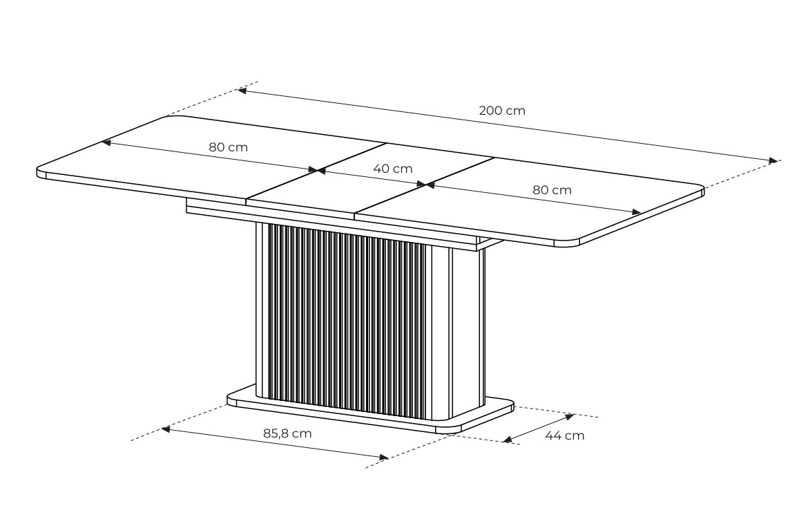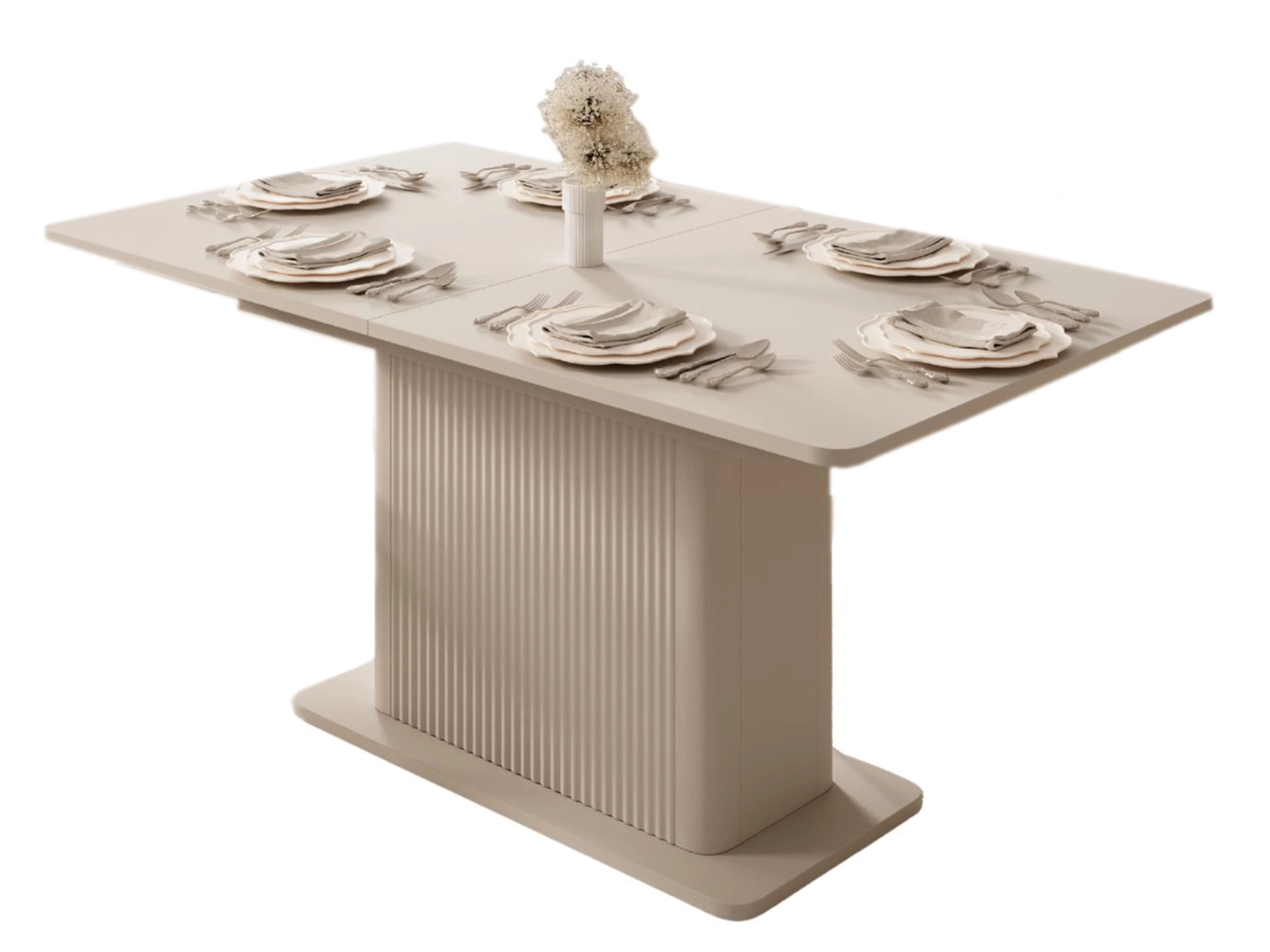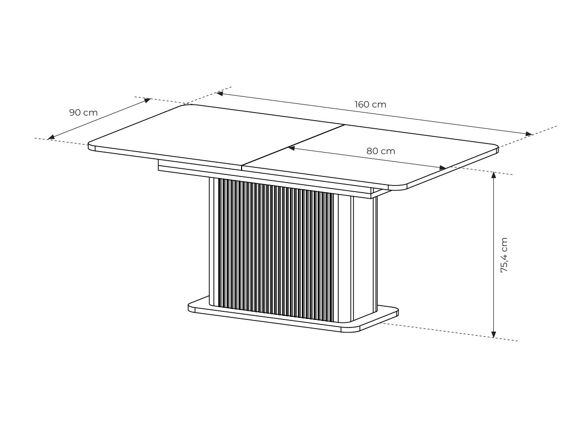 Centralna podstawa stołu o dekoracyjnym, pionowym frezowaniu przyciąga uwagę i nadaje meblowi unikalnego charakteru. To nie tylko element konstrukcyjny, ale także ozdobny akcent, który podkreśla ekskluzywny wygląd całej bryły. Stabilna konstrukcja zapewnia komfort użytkowania, a jednocześnie pozostawia dużo miejsca na swobodne ustawienie krzeseł.