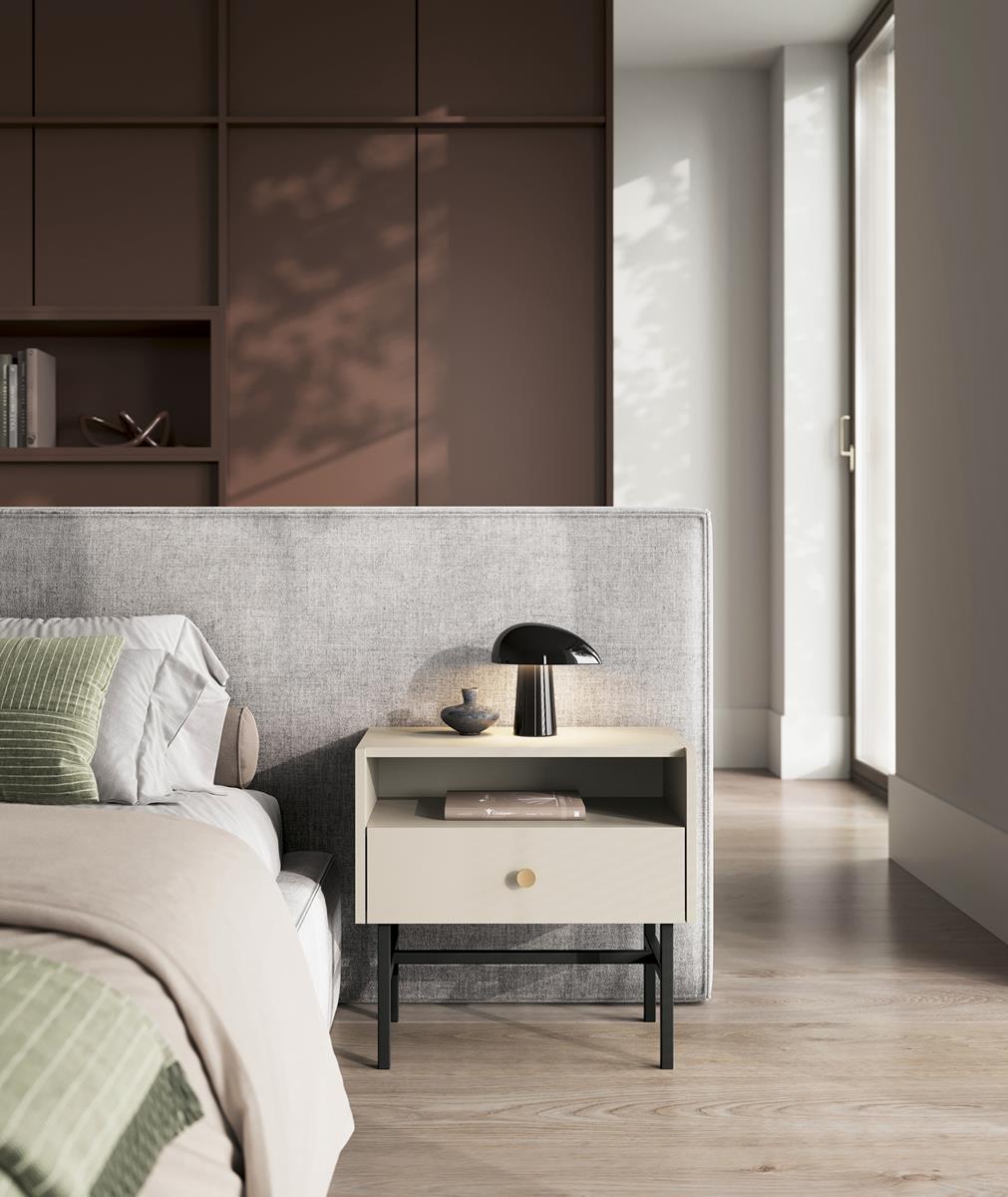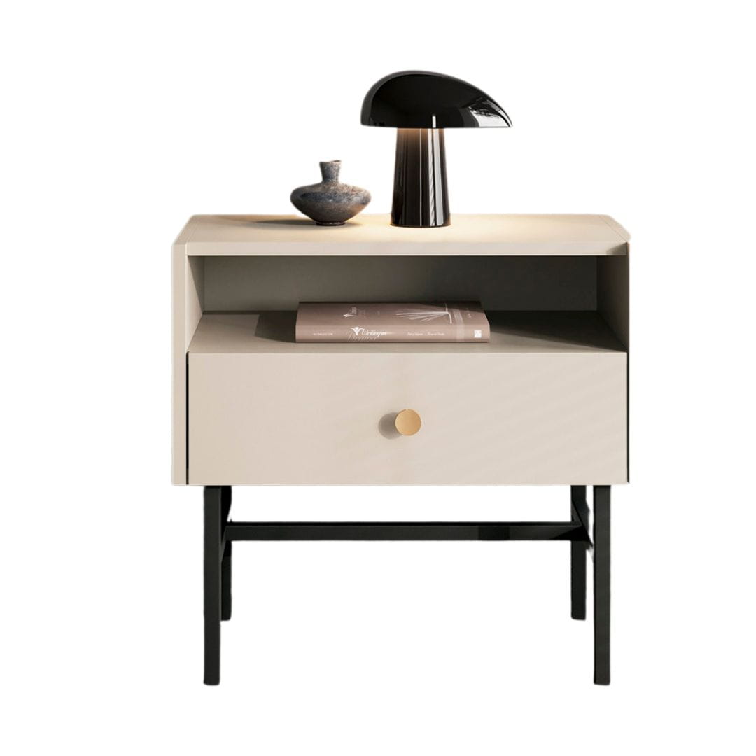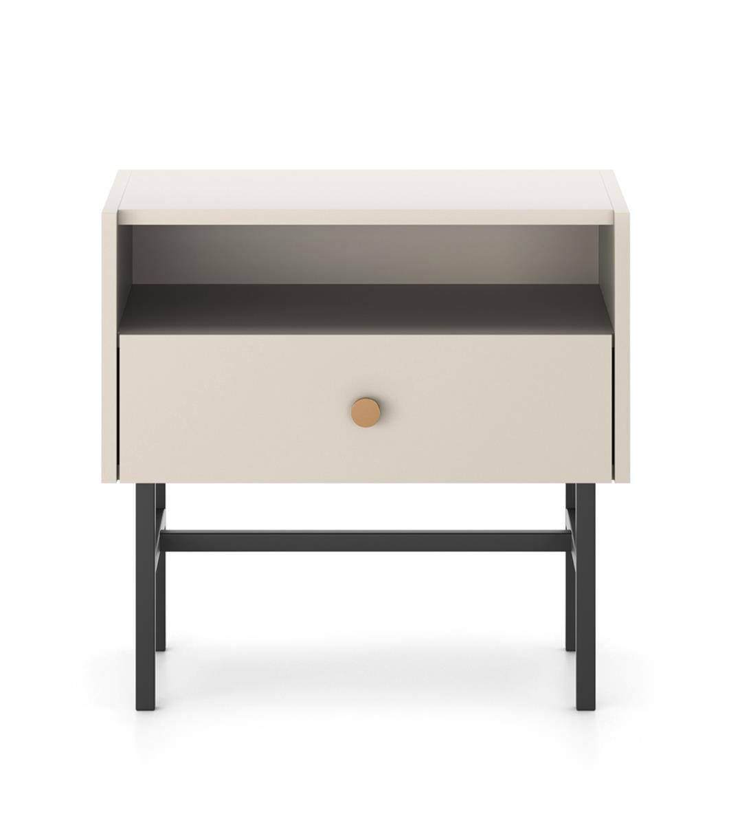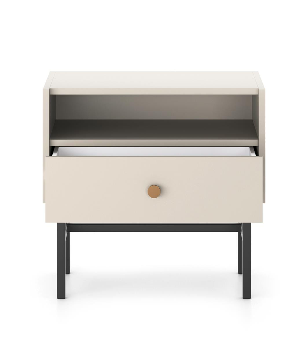 Stolik nocny beżowy z szufladą i otwartą półką na czarnych nogach