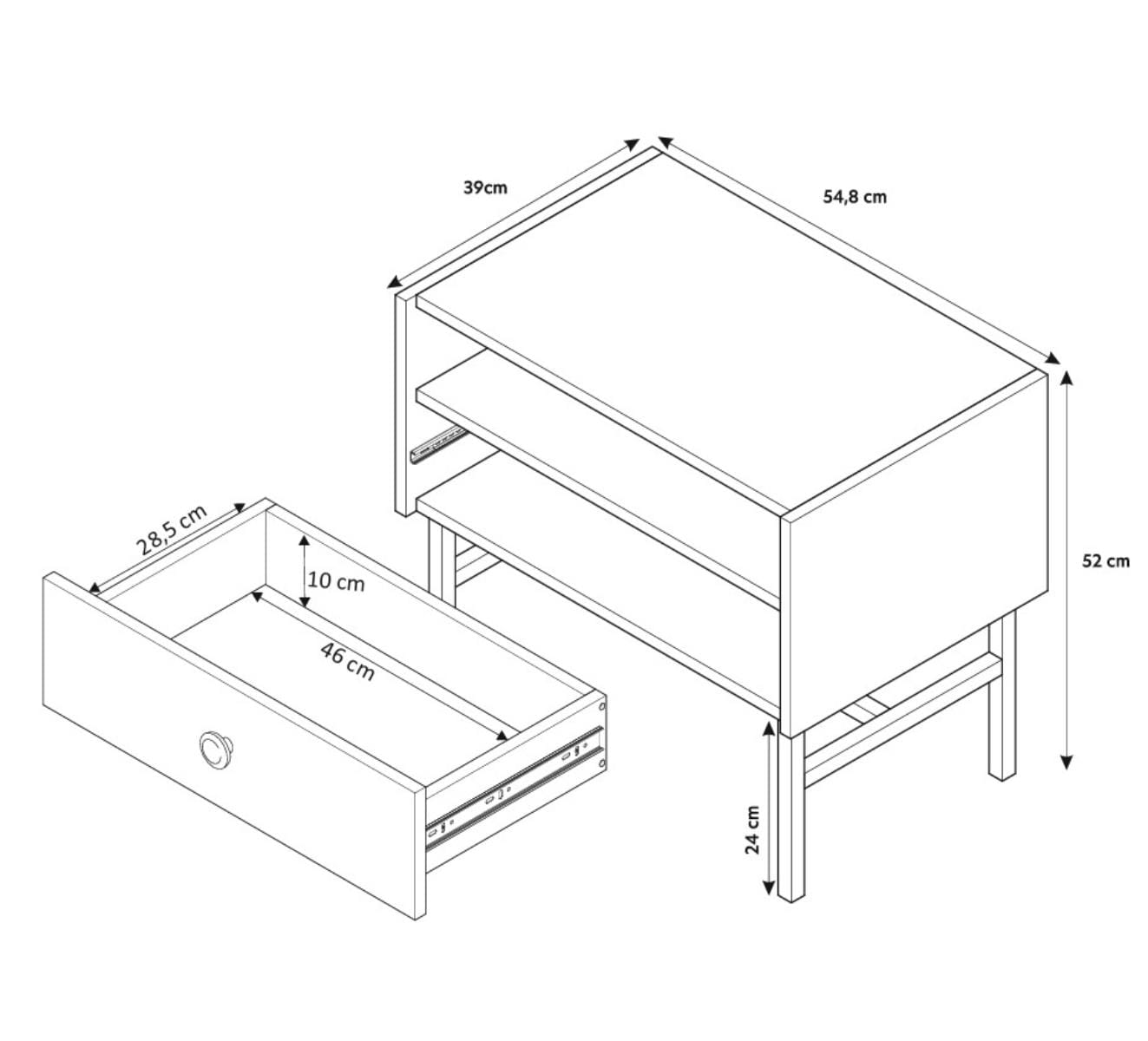 Mebel wyposażony jest w praktyczną szufladę z mechanizmem cichego zamykania, co zapewnia komfortowe i bezgłośne użytkowanie, a otwarta półka pozwala na wygodne przechowywanie książek, czasopism lub drobnych akcesoriów. Czarne metalowe nóżki nadają konstrukcji lekkości, stabilności i nowoczesnego charakteru, a ich wysokość ułatwia utrzymanie czystości pod stolikiem.