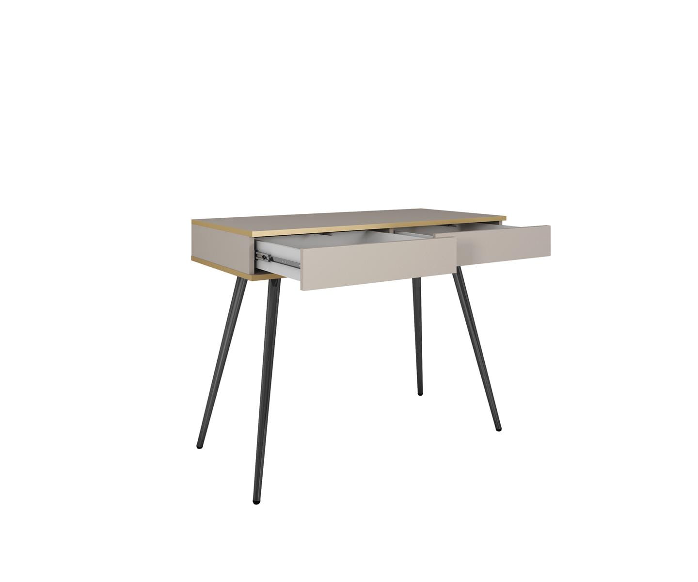 Toaletka została wykonana z wysokiej jakości płyty laminowanej o grubości 16 mm, co gwarantuje trwałość oraz odporność na zarysowania i uszkodzenia. Jej dwie przestronne szuflady to idealne miejsce na kosmetyki, akcesoria i inne niezbędne drobiazgi. Dzięki zastosowaniu systemu „push to open” otwieranie szuflad jest proste i wygodne, co eliminuje potrzebę montowania uchwytów i podkreśla minimalistyczny styl mebla.