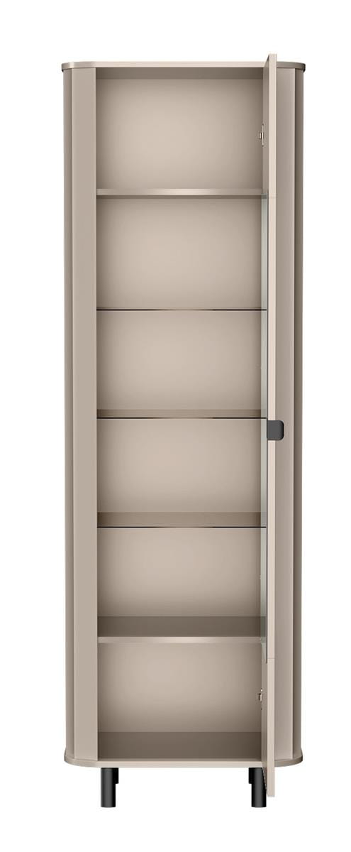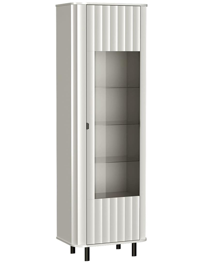 Dekoracyjne ryflowania na froncie nadają witrynie wyjątkowego charakteru, a przeszklona część z hartowanego szkła pozwala wyeksponować ulubione dekoracje, porcelanę lub książki. Smukłe, czarne nóżki podkreślają nowoczesny design, a jednocześnie dodają meblowi stabilności.
