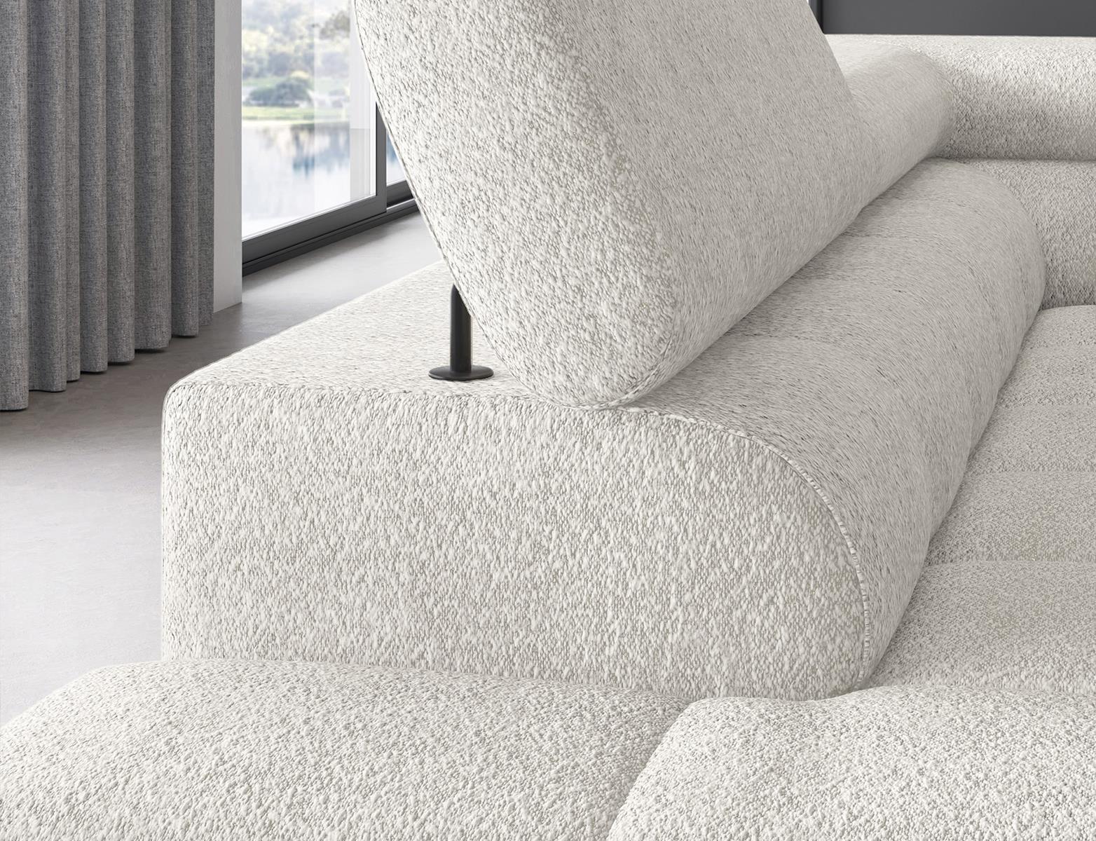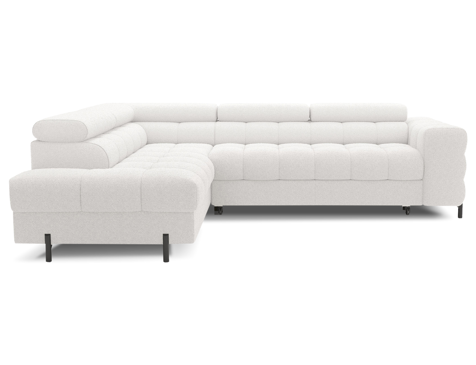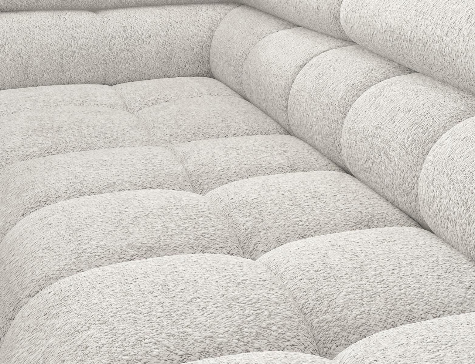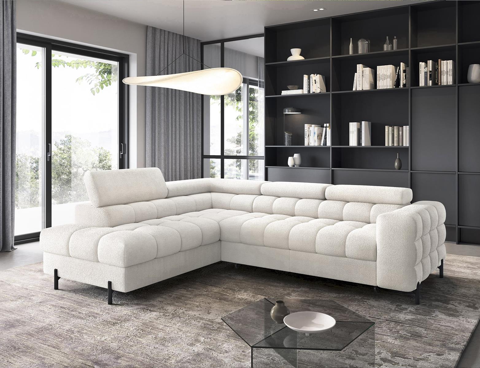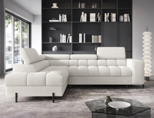 Nowoczesny narożnik w białej tkaninie bouclé to połączenie elegancji, funkcjonalności i najwyższego komfortu użytkowania. Jego subtelna forma oraz miękka, przyjemna w dotyku faktura tkaniny sprawiają, że idealnie wpisuje się w wystrój nowoczesnych, minimalistycznych i glamour wnętrz. Jasny kolor optycznie powiększa przestrzeń i dodaje jej lekkości, czyniąc narożnik prawdziwą ozdobą salonu.