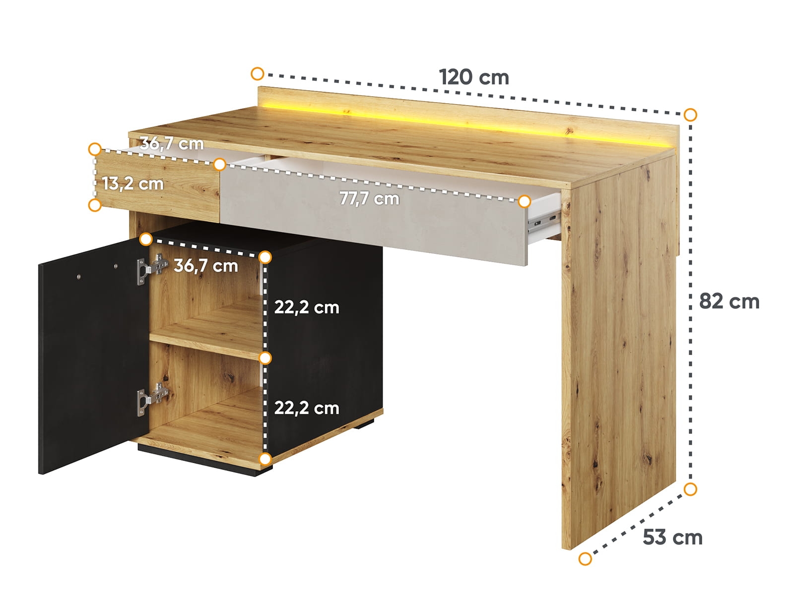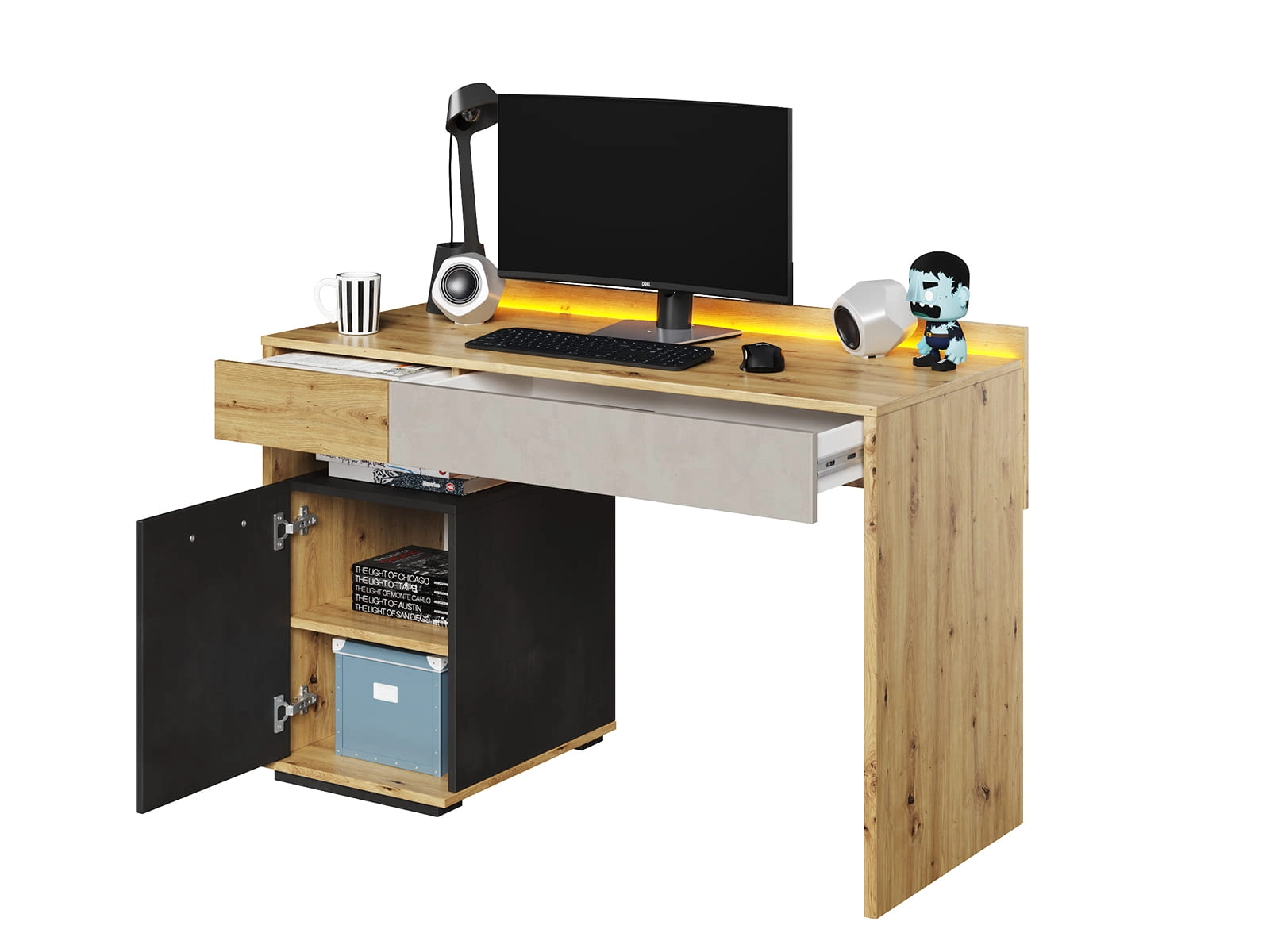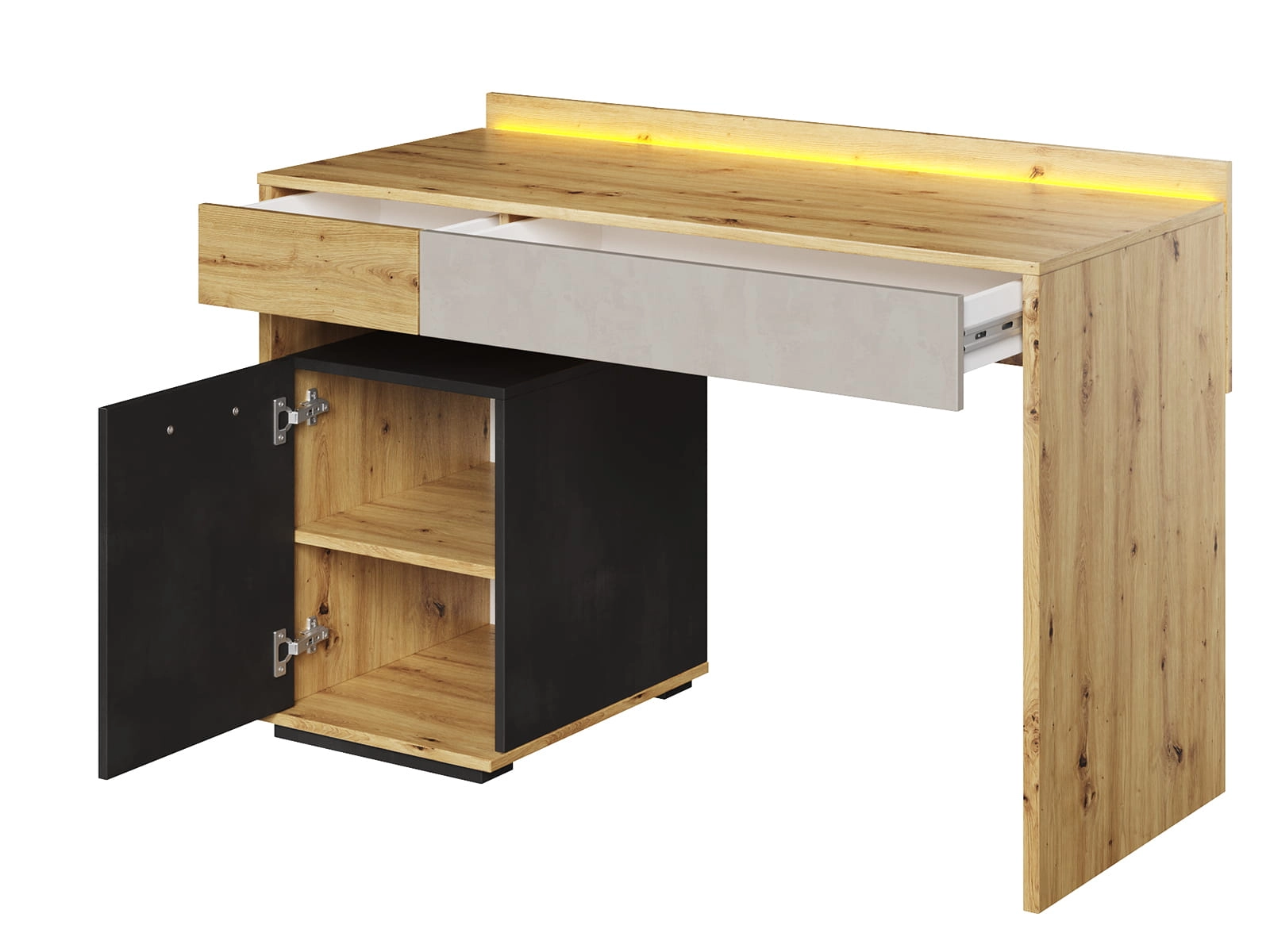 Blat jest szeroki i wygodny do nauki, pracy przy komputerze lub rysowania. Przy tylnej krawędzi znajduje się oświetlenie LED, które tworzy delikatną poświatę. To ułatwia korzystanie z biurka wieczorem i dodaje mu nowoczesnego charakteru. Pod blatem znajduje się szuflada na drobiazgi oraz pojemna szafka, w której można trzymać książki, segregatory lub inne potrzebne rzeczy. Układ jest prosty, więc łatwo utrzymać porządek.