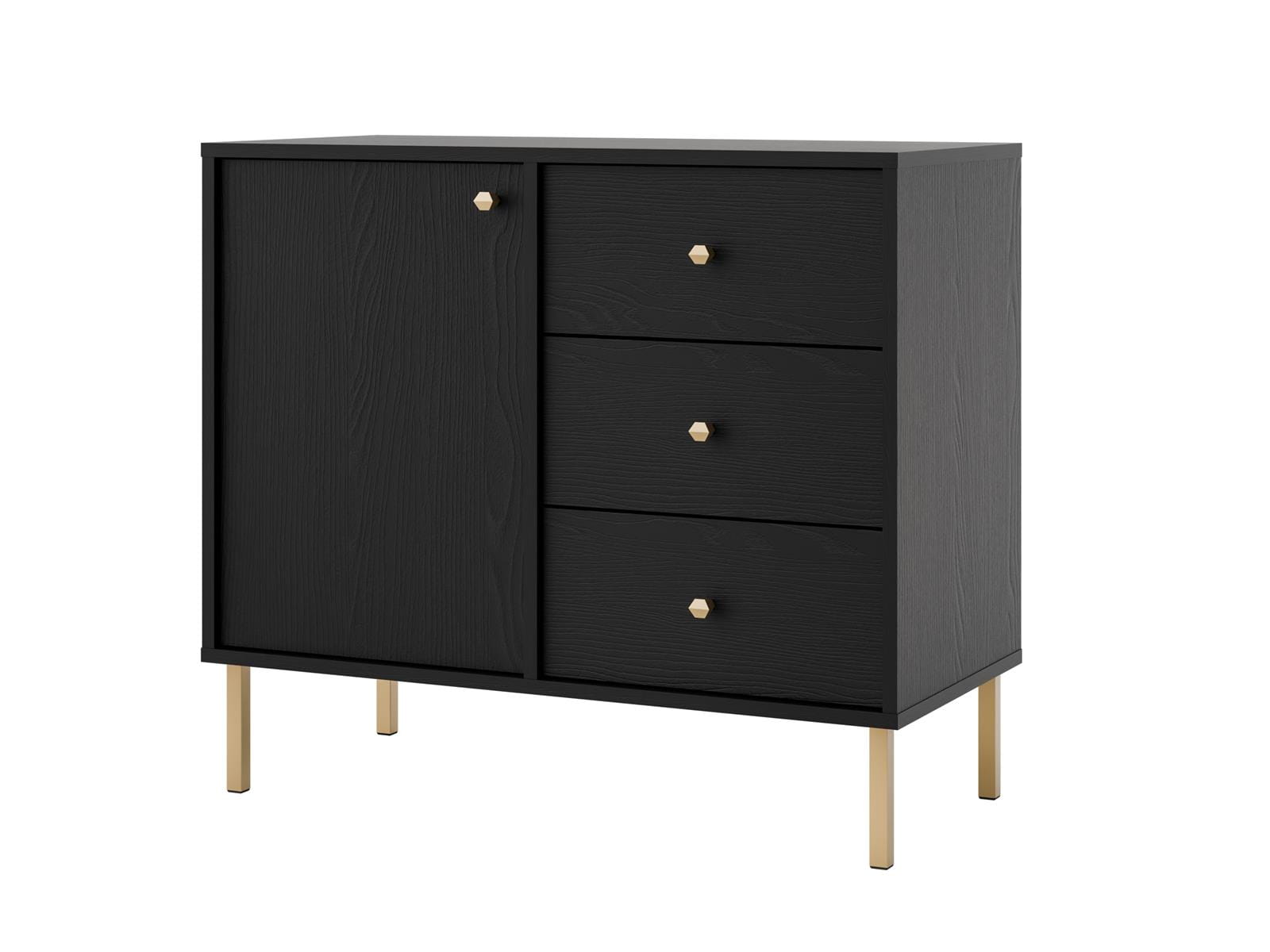 Czarna komoda z szafką i trzema szufladami ze złotymi elementami to idealny wybór dla osób, które szukają połączenia funkcjonalności z luksusem i nowoczesnym designem. Wprowadź do wnętrza praktyczny i stylowy mebel, który stanie się eleganckim akcentem w Twoim domu.