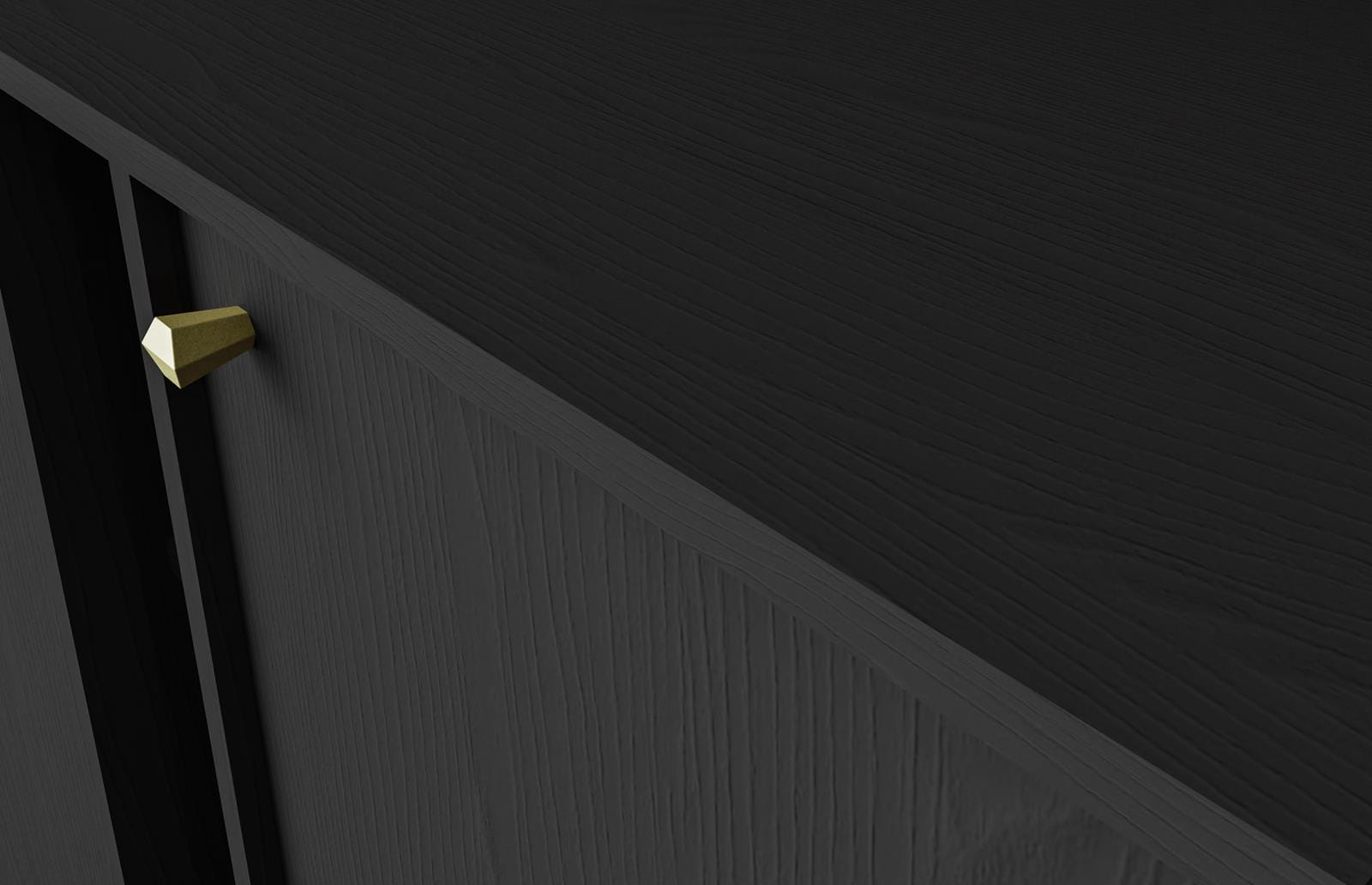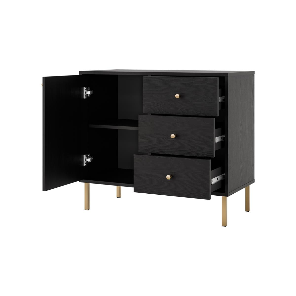 Czarna komoda z jedną szafką i trzema szufladami ze złotymi elementami to nowoczesny i elegancki mebel, który wprowadza do wnętrza szyk i luksusowy akcent. Głęboki, matowy czarny kolor nadaje pomieszczeniu nowoczesny charakter, a złote uchwyty i detale podkreślają designerski i ekskluzywny styl.