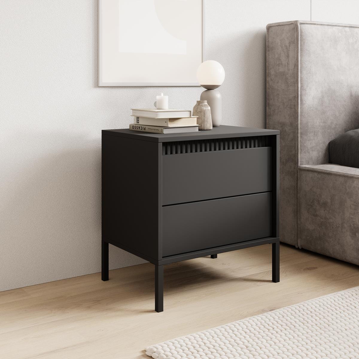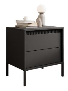 Wyrazisty akcent i maksymalna praktyczność.Czarny GAVINS to stolik nocny dla tych, którzy cenią nowoczesny design i maksymalną funkcjonalność. Wyposażony w dwie pojemne szuflady z wygodnym systemem push-to-open, zapewnia wygodę użytkowania i elegancki wygląd bez widocznych uchwytów. Wysokie nóżki nadają lekkości i wpisują się w obecne trendy wnętrzarskie, ułatwiając przy tym utrzymanie porządku. Głęboka czerń dodaje wnętrzu wyrazistości i charakteru, tworząc kontrastowe zestawienia z jasnymi tekstyliami i ścianami.