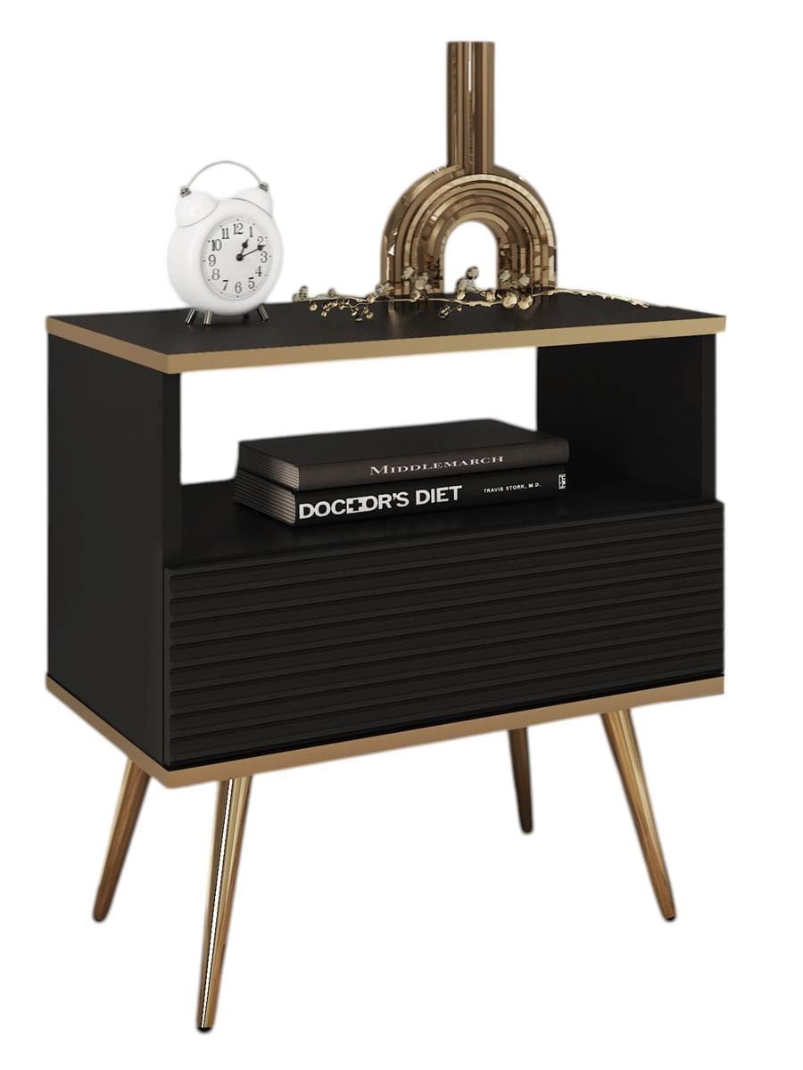 Czarna ryflowana szafka nocna do sypialni ze złotymi nogami POLO