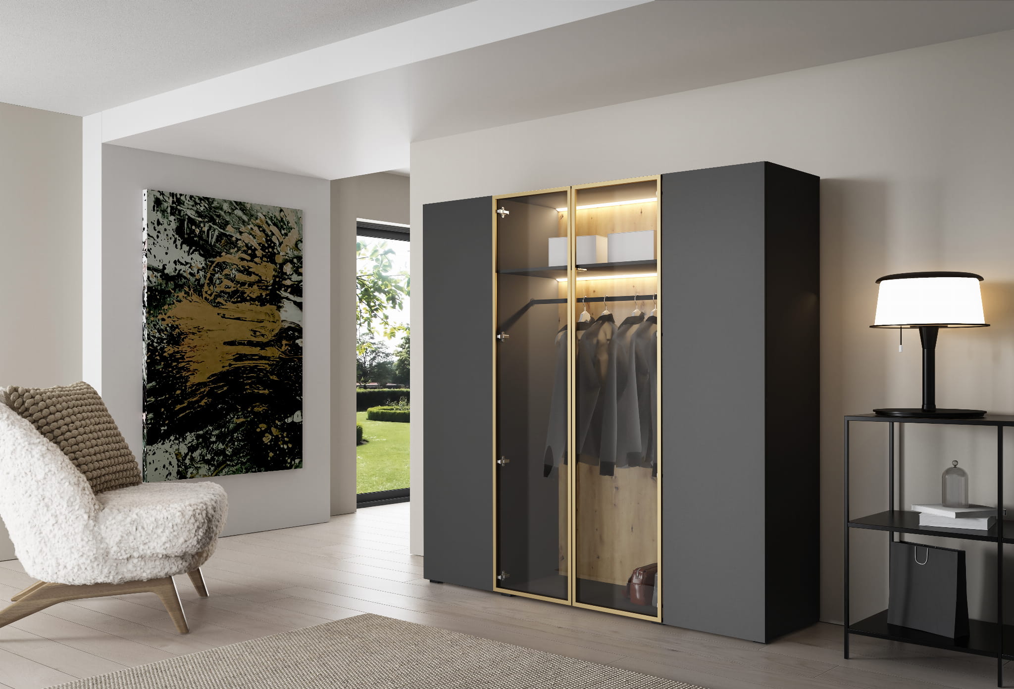 Wnętrze szafy wyposażone jest w solidny drążek na ubrania, pozwalający na wygodne przechowywanie marynarek, sukienek i płaszczy. Dodatkowe półki i schowki zapewniają przestrzeń na akcesoria, pudełka i inne elementy garderoby. Dzięki szklanym drzwiom ubrania są odpowiednio wyeksponowane, a jednocześnie chronione przed kurzem. Opcjonalne oświetlenie LED nadaje całości wyjątkowego charakteru i podkreśla elegancję mebla, tworząc nowoczesny klimat w pomieszczeniu, a zawiasy z systemem cichego domykania zapewniają komfort użytkowania i stabilność konstrukcji.