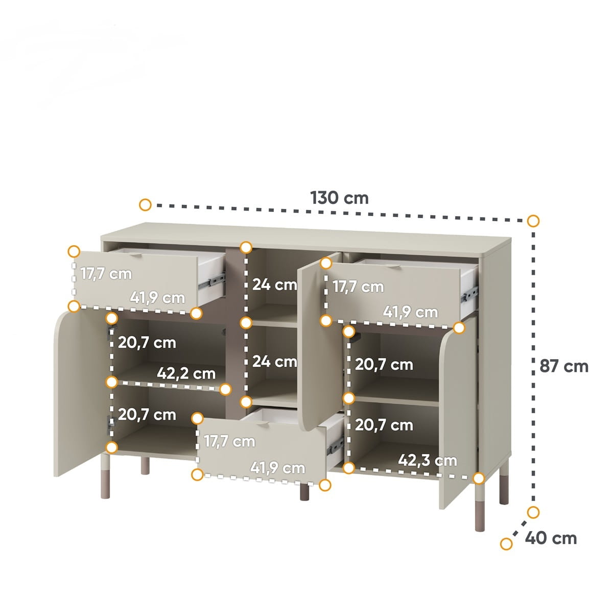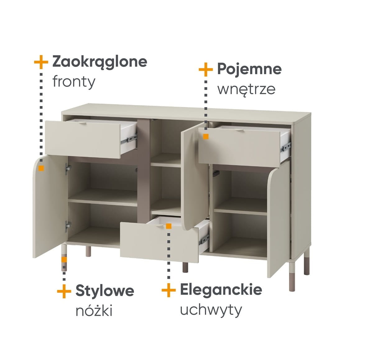 Komoda JUNA w kolorze kaszmirowym to elegancki i praktyczny mebel, który sprawdzi się zarówno w pokoju młodzieżowym, jak i w sypialni czy salonie. Wyposażona w 3 pojemne szuflady oraz 3 zamykane szafki, oferuje mnóstwo miejsca do przechowywania ubrań, książek, dokumentów czy domowych akcesoriów.