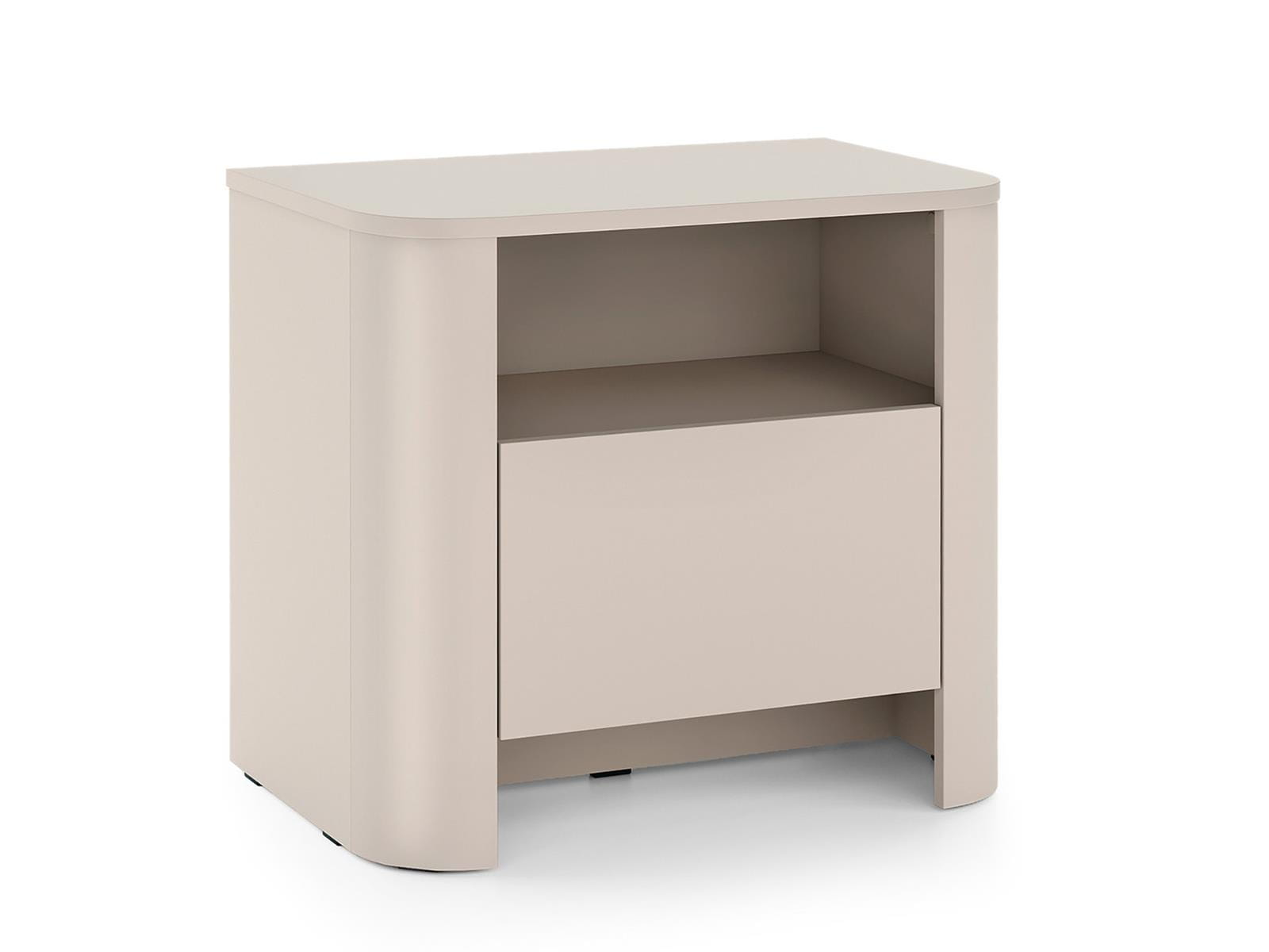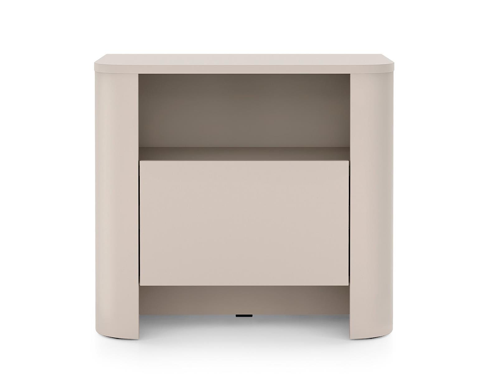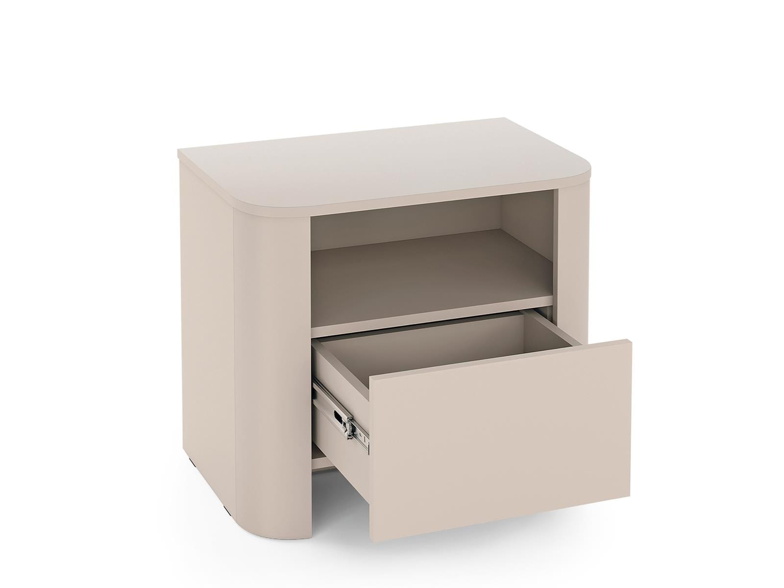 Stolik posiada pojemną szufladę oraz otwartą półkę, które zapewniają wygodę przechowywania i pozwalają utrzymać porządek w strefie nocnej. Zaokrąglone boki dodają mu lekkości i sprawiają, że prezentuje się niezwykle designersko.
