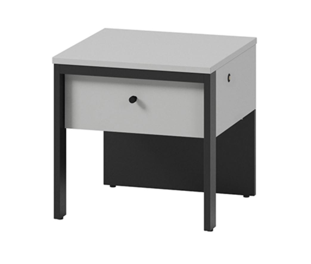 Szafka nocna dobrze pasuje do współczesnej sypialni, bo łączy prosty kształt z praktycznym układem. Szary korpus i czarna metalowa rama tworzą spokojne, ale wyraziste połączenie. Dzięki temu mebel łatwo dopasować do łóżka, tekstyliów i innych elementów wystroju.