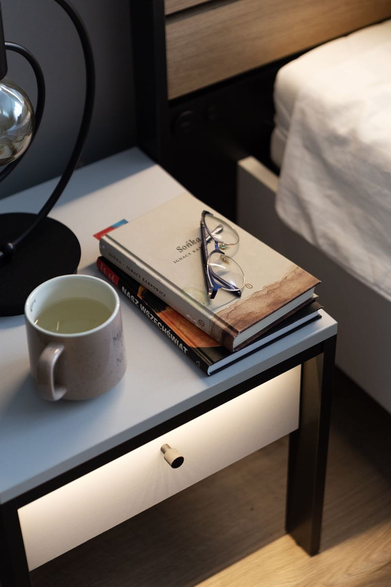 Szuflada daje wygodne miejsce na rzeczy, które chcesz mieć pod ręką przed snem — książkę, ładowarkę czy drobiazgi, które zwykle lądują na blacie. Sam blat jest stabilny i nadaje się na lampkę, szklankę wody lub dekorację. Wbudowane oświetlenie LED dodaje szafce nastroju i pomaga korzystać z niej wieczorem bez włączania mocnego światła w pokoju.