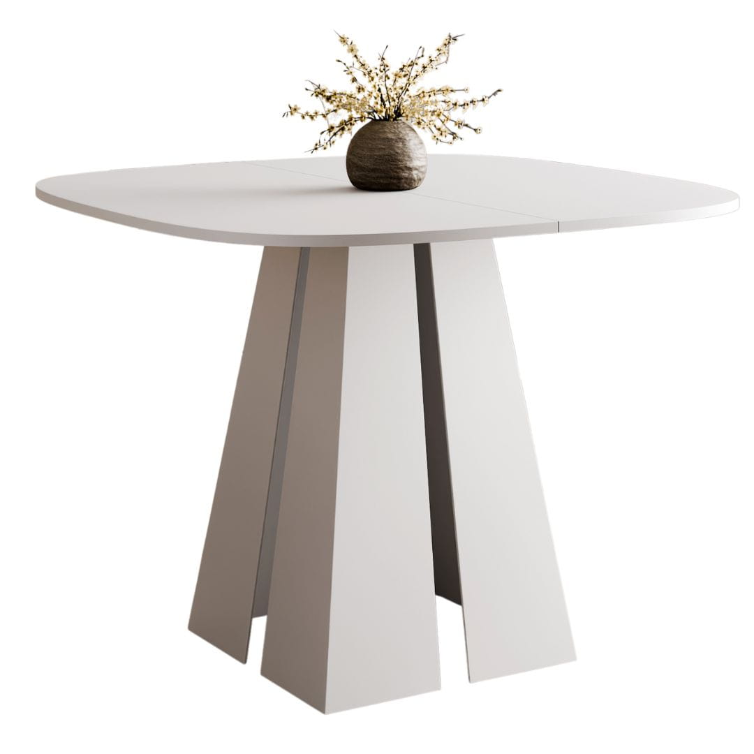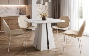 Stół wyróżnia się nowoczesnym designem - minimalistyczna forma w białym kolorze doskonale komponuje się z wnętrzami w stylu skandynawskim, loftowym, glamour czy klasycznym. Solidna, geometryczna podstawa nadaje mu stabilność i niepowtarzalny charakter, a jednocześnie podkreśla jego elegancki wygląd.