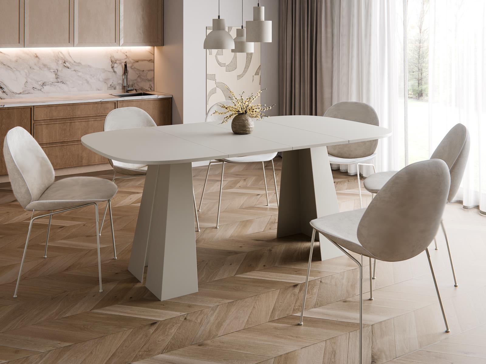 Dzięki neutralnej barwie i ponadczasowemu kształtowi, stół można łatwo zestawić z różnymi krzesłami, tworząc spójną i wyjątkową aranżację jadalni lub salonu. To propozycja dla osób, które poszukują mebla łączącego styl, funkcjonalność i trwałość, a także chcą, by ich przestrzeń nabrała lekkości i szyku.