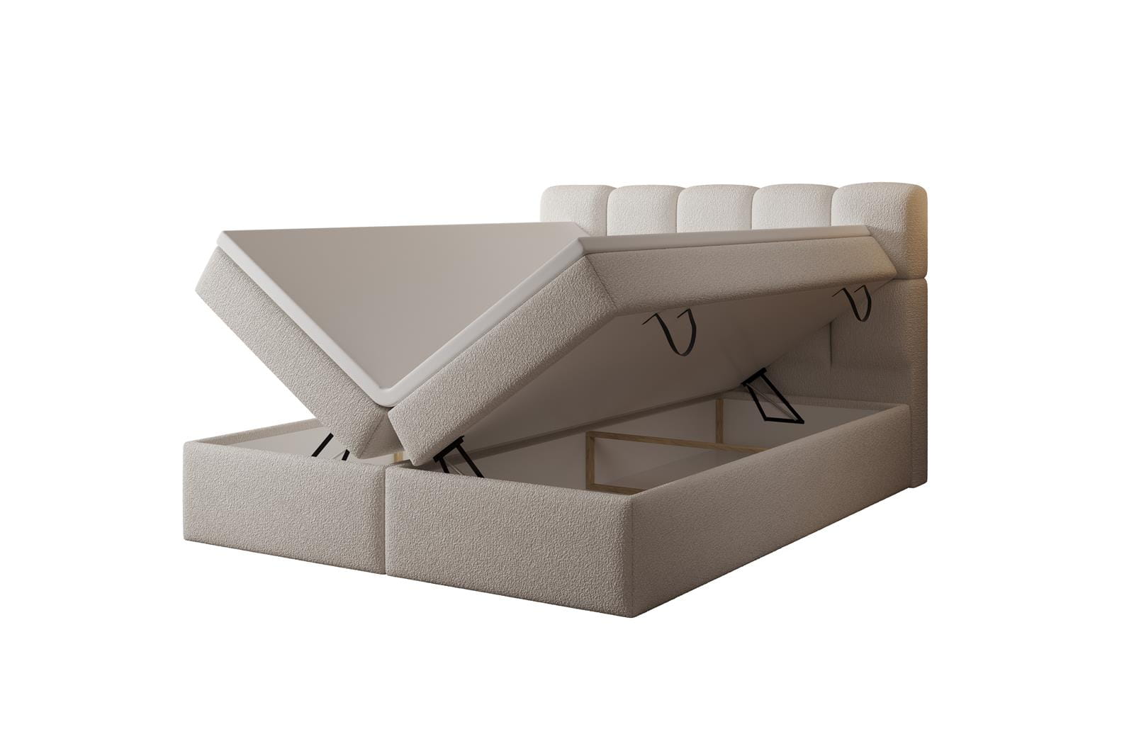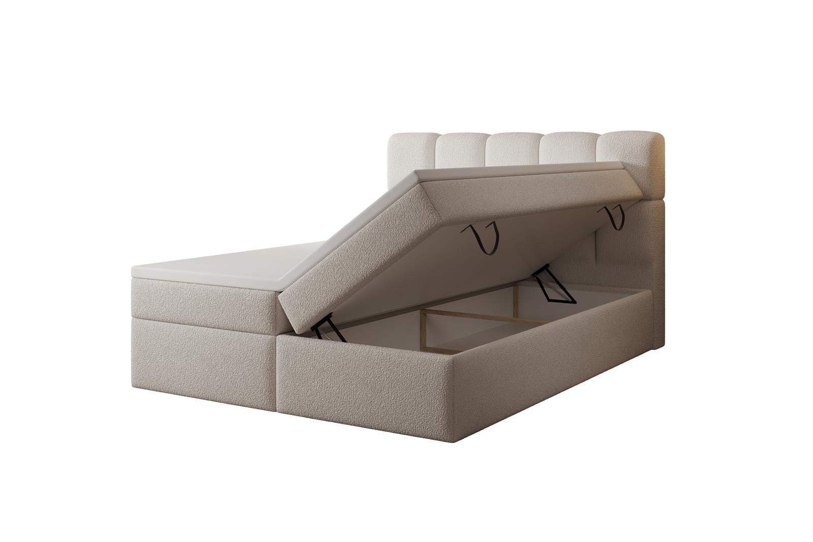 Łóżko zostało zaprojektowane tak, aby łączyć styl z praktycznością - posiada dwie skrzynie na pościel po obu stronach, które pozwalają na wygodne przechowywanie tekstyliów i utrzymanie porządku w sypialni. Pikowany zagłówek tapicerowany w grafitowej tkaninie nadaje wnętrzu nowoczesnego charakteru, a jednocześnie zapewnia wygodne oparcie podczas czytania książki czy oglądania telewizji.