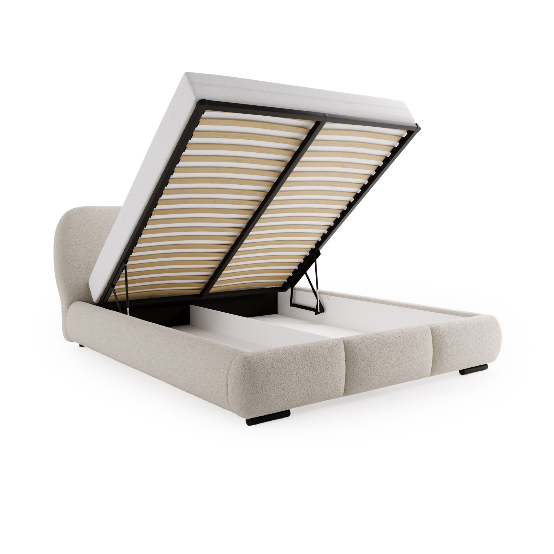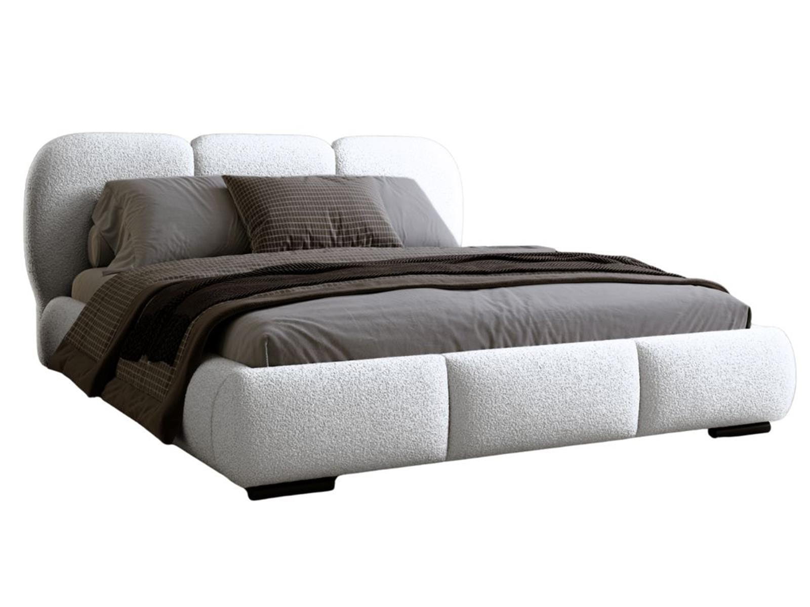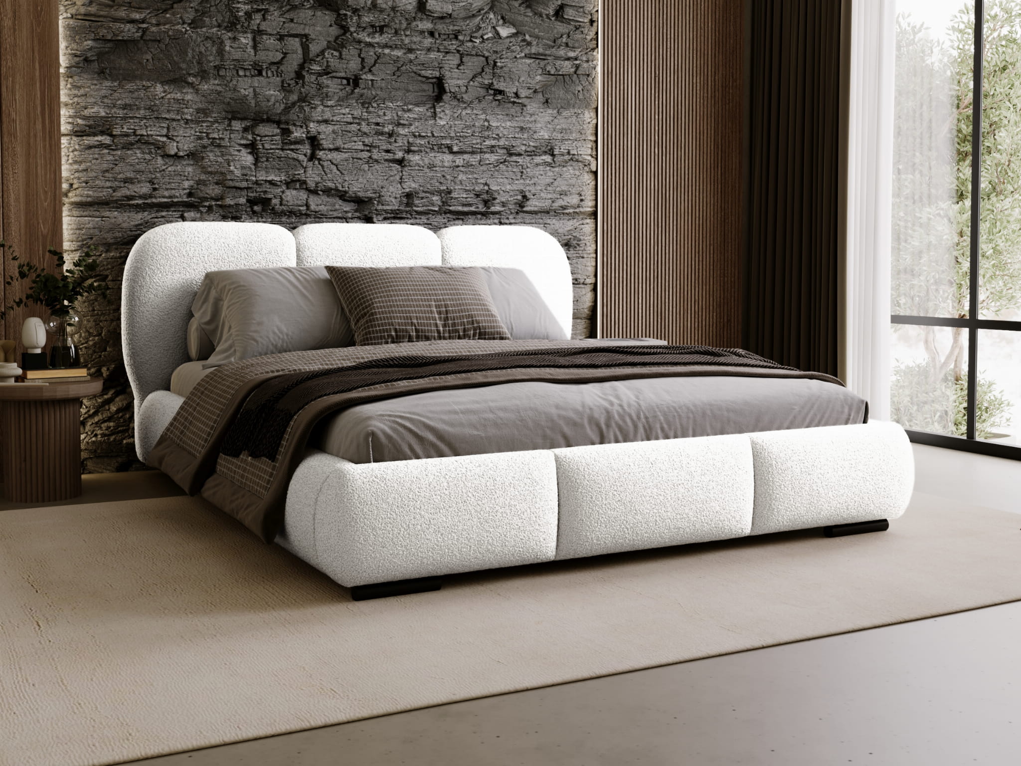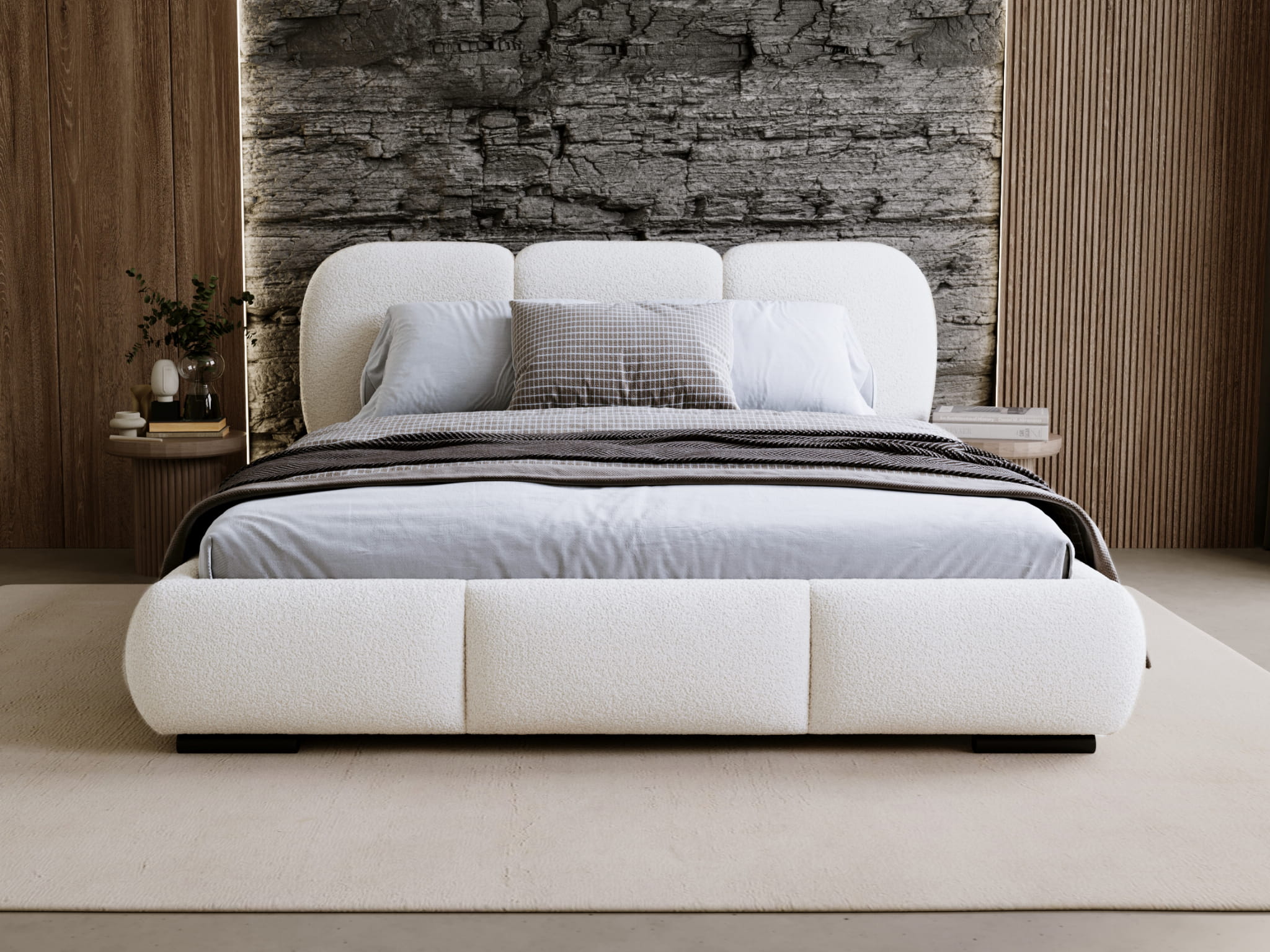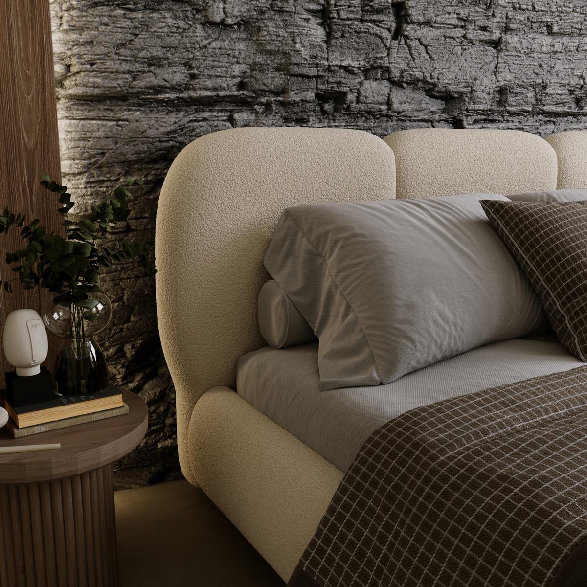 Tapicerowane łóżko o zaokrąglonym kształcie w tkaninie bouclé