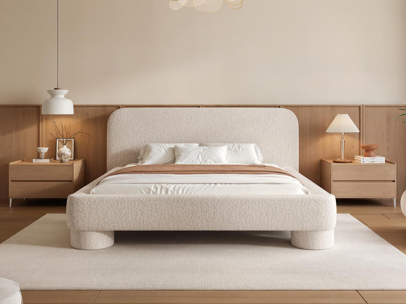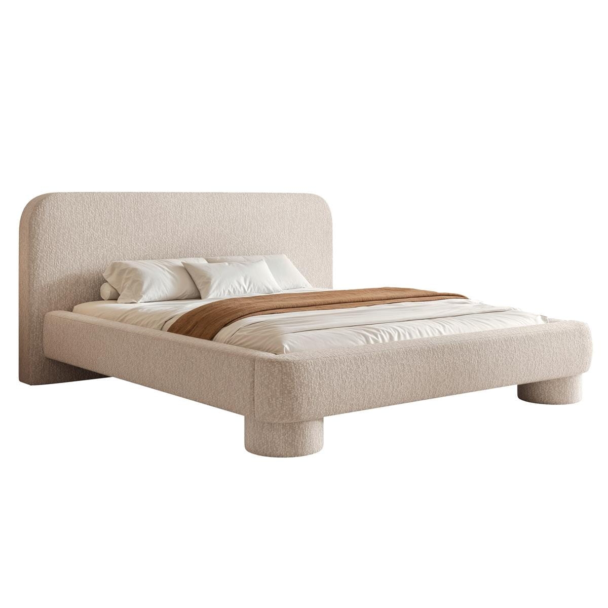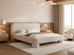 Łóżko tapicerowane na wysokich zaokrąglonych nóżkach beż
