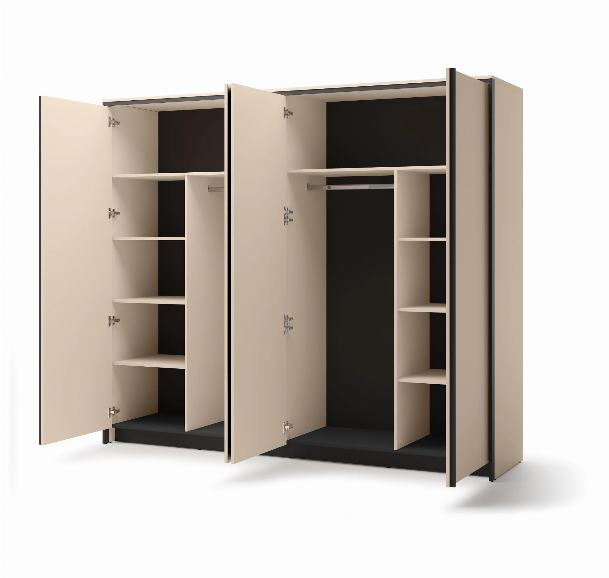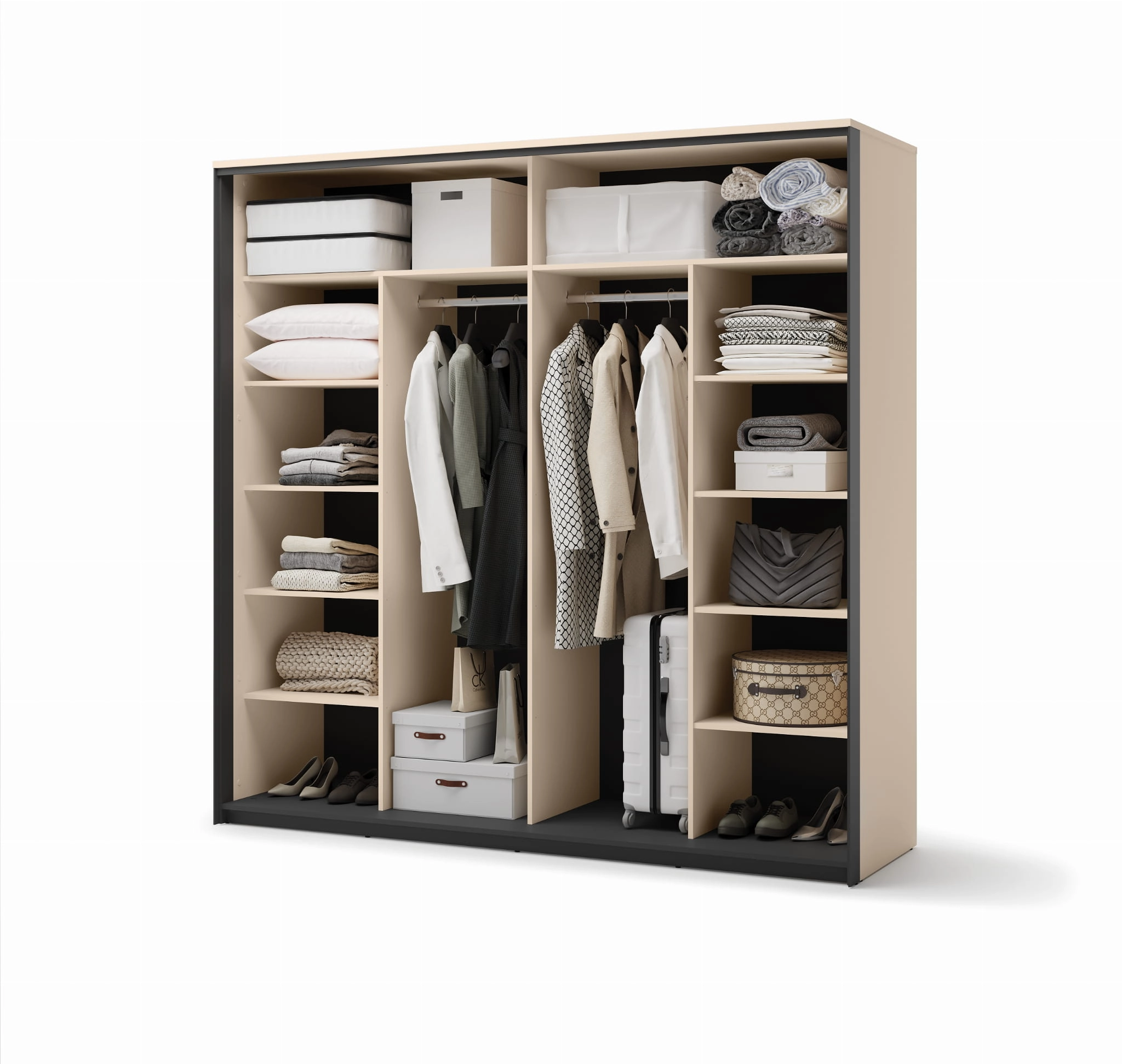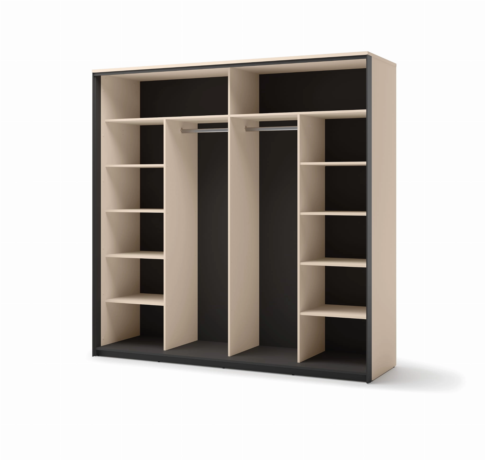 Dzięki systemowi drzwi przesuwnych mebel sprawdza się nawet w mniejszych wnętrzach, pozwalając na swobodne otwieranie bez zajmowania dodatkowego miejsca. Subtelne oświetlenie LED podkreśla nowoczesny styl szafy i dodaje wnętrzu wyjątkowego klimatu.