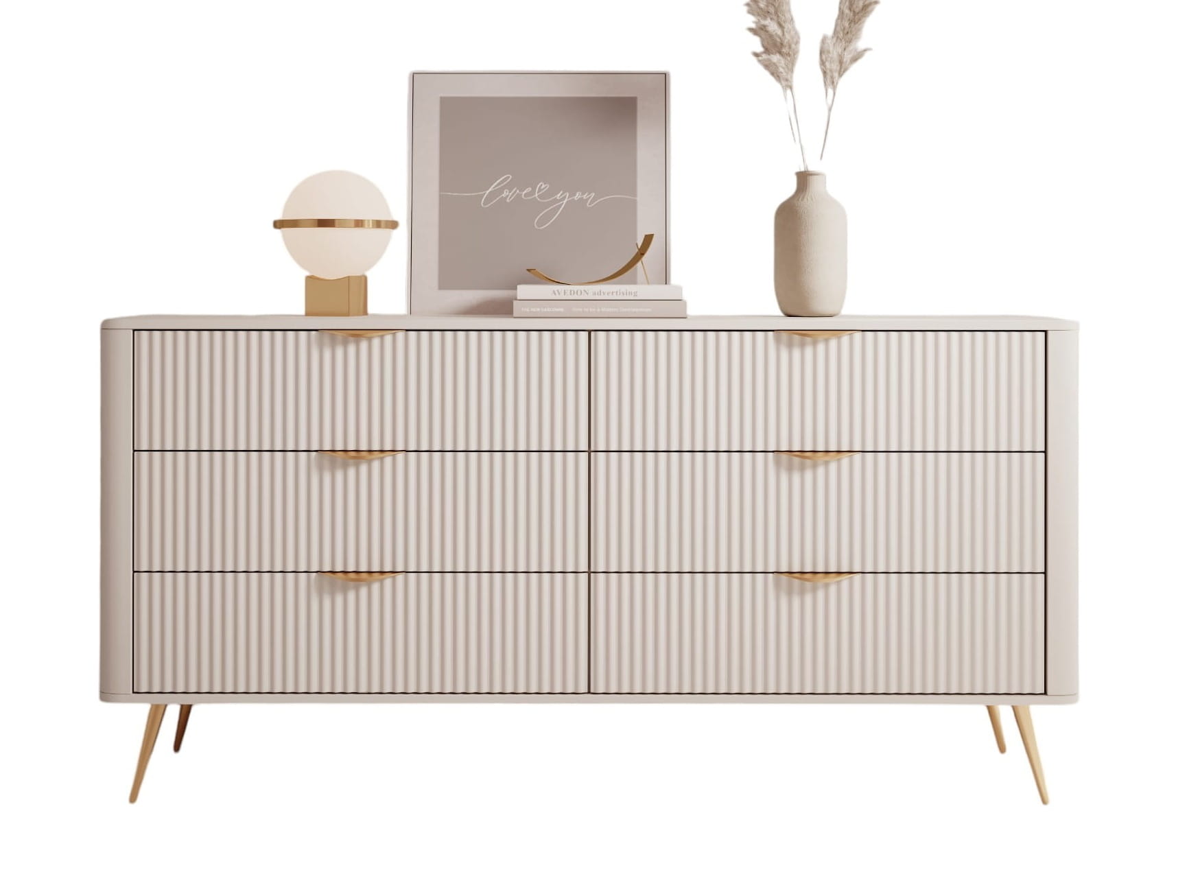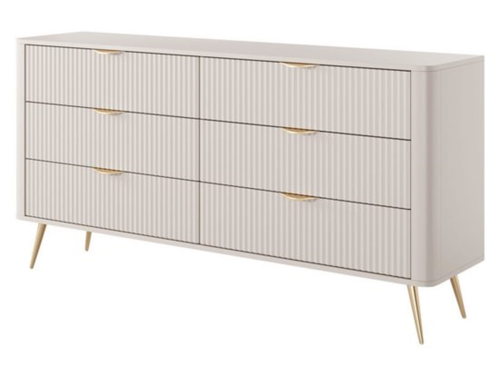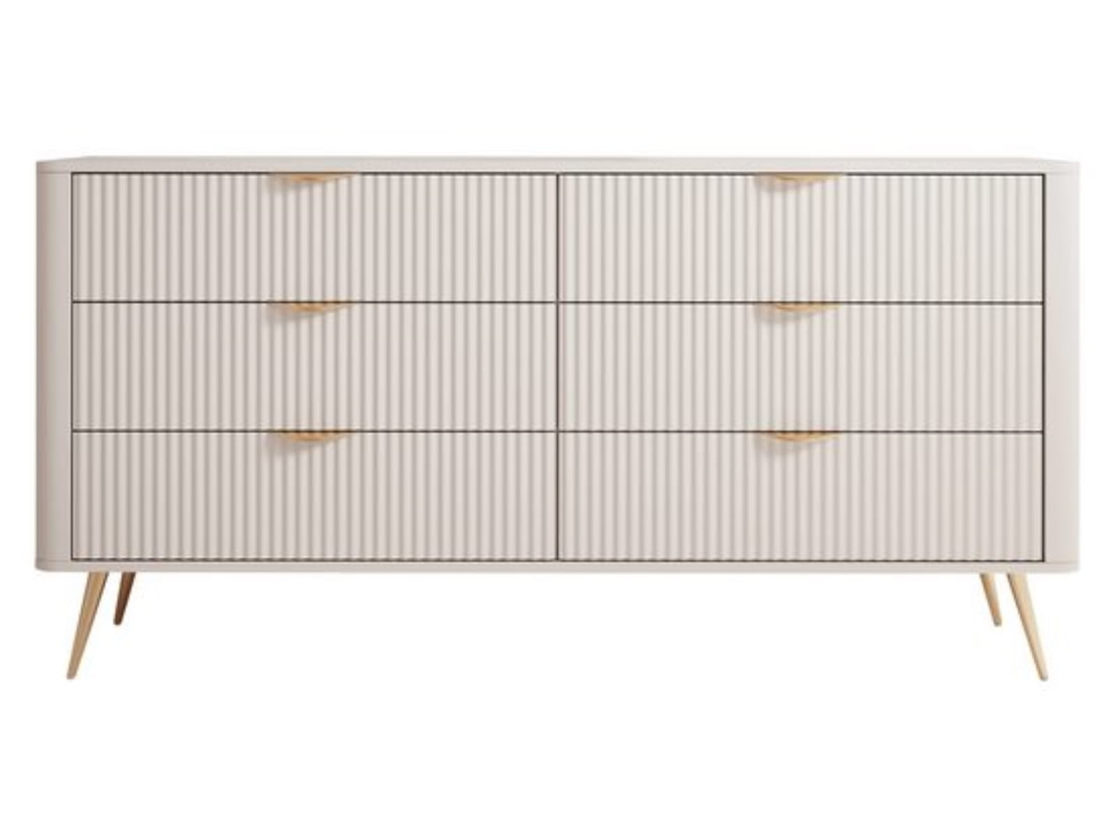 Delikatna beżowa kolorystyka nadaje wnętrzu harmonii i subtelności, a ryflowany front nadaje meblowi głębi i wyrazistości. W połączeniu ze złotymi uchwytami oraz wysokimi, metalowymi nóżkami komoda zyskuje luksusowy, wręcz biżuteryjny charakter. Doskonale sprawdzi się w aranżacjach typu glamour czy nowoczesnym. Jej największym atutem – obok designu – jest funkcjonalność. Sześć przestronnych szuflad umożliwia przechowywanie wszystkiego: od ubrań i dodatków, przez dokumenty, aż po tekstylia czy akcesoria codziennego użytku. Prowadnice kulkowe z pełnym wysuwem zapewniają płynne i wygodne użytkowanie, niezależnie od stopnia wypełnienia.