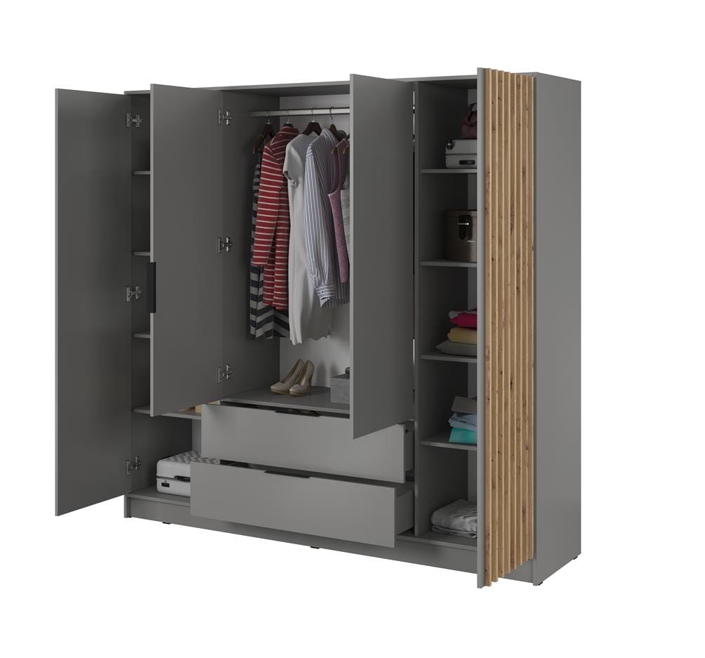 Nowoczesna szafa z lamelami w kolorze szarym to wyjątkowy mebel, który łączy w sobie funkcjonalność, estetykę oraz solidne wykonanie. Czterodrzwiowa konstrukcja z dodatkowymi pojemnymi szufladami zapewnia doskonałą organizację przestrzeni do przechowywania odzieży, akcesoriów oraz innych domowych przedmiotów. Pionowe lamelowe wstawki w kolorze czarnym nadają szafie elegancki, minimalistyczny charakter, idealnie wpisujący się w nowoczesne aranżacje wnętrz — styl loft, industrialny, skandynawski czy nowoczesny.