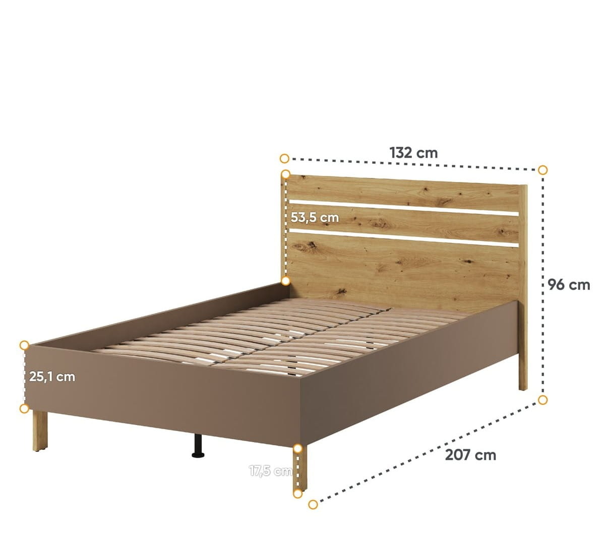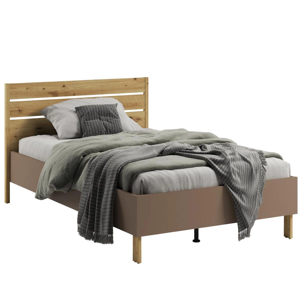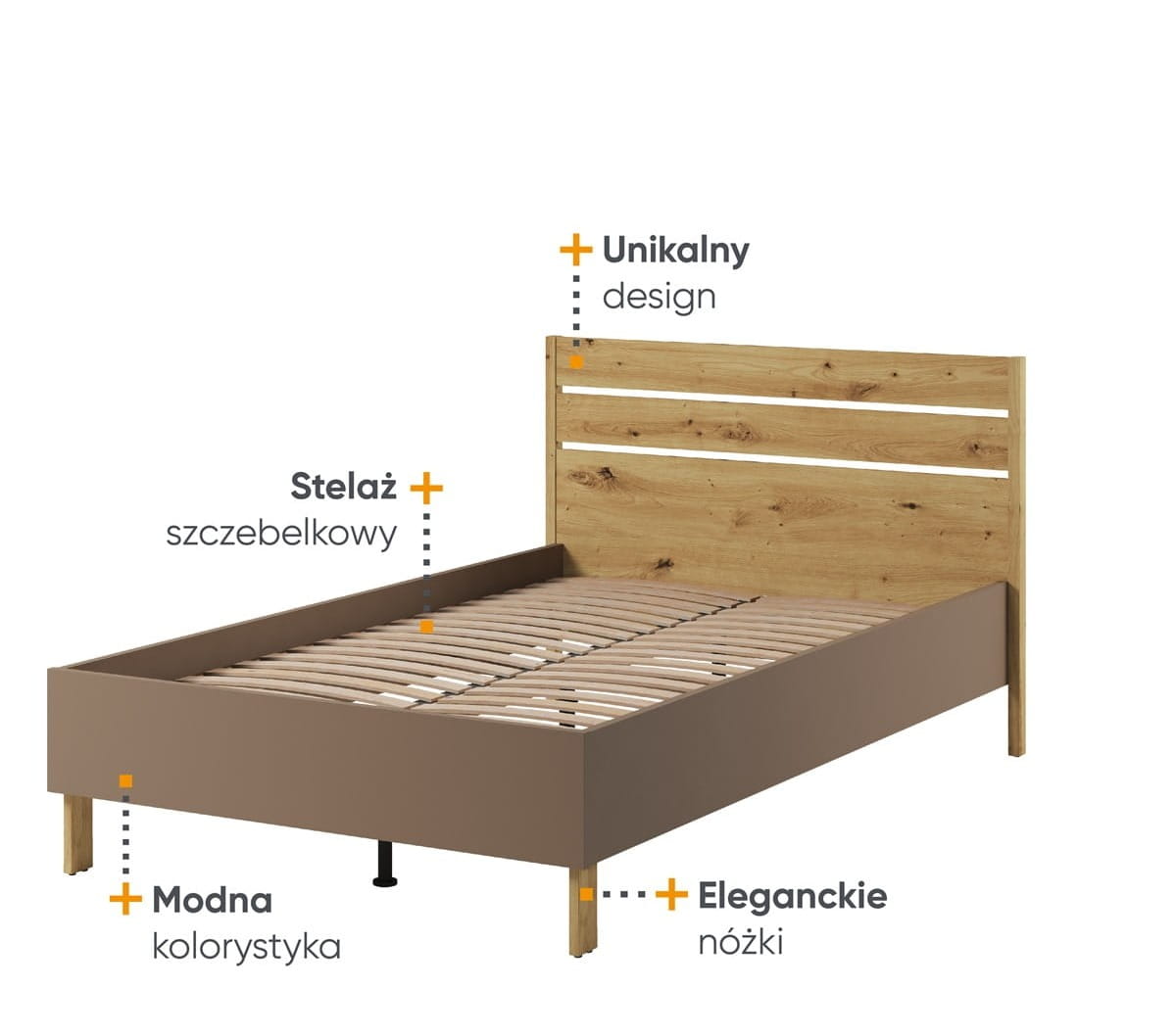 Łóżko zapewnia przestronne miejsce do spania, co gwarantuje zdrowy i komfortowy sen. Jego solidna konstrukcja sprawia, że jest trwałe i bezpieczne, a jednocześnie świetnie komponuje się z pozostałymi elementami kolekcji - szafą, regałem, biurkiem czy stolikiem nocnym. To mebel, który nie tylko pełni funkcję praktyczną, ale również nadaje wnętrzu elegancji i charakteru.