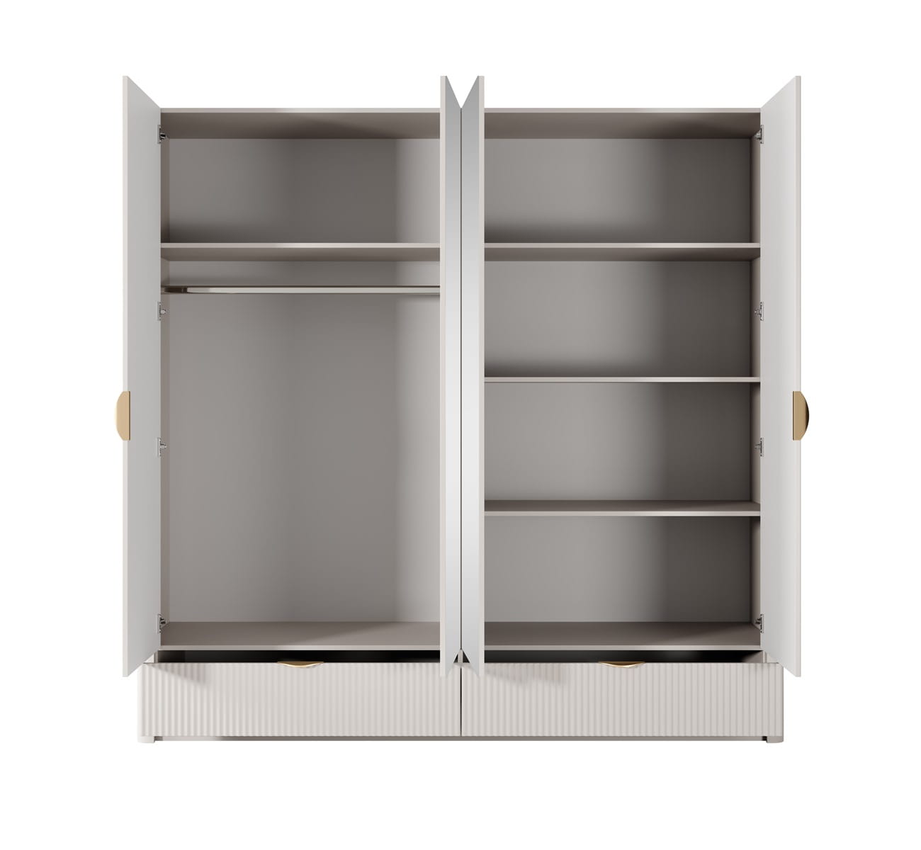 Nowoczesna szafa z lustrem w kolorze BEŻOWY to idealne rozwiązanie do każdej sypialni, garderoby czy przedpokoju. Jej minimalistyczny design w połączeniu z ryflowanymi frontami nadaje wnętrzu elegancji i ponadczasowego charakteru.Szafa wyposażona jest w duże lustro umieszczone na frontach drzwi uchylnych, co nie tylko optycznie powiększa przestrzeń, ale również podnosi funkcjonalność mebla. Dzięki temu możesz wygodnie sprawdzić swój strój bez potrzeby montowania dodatkowego lustra w pokoju.