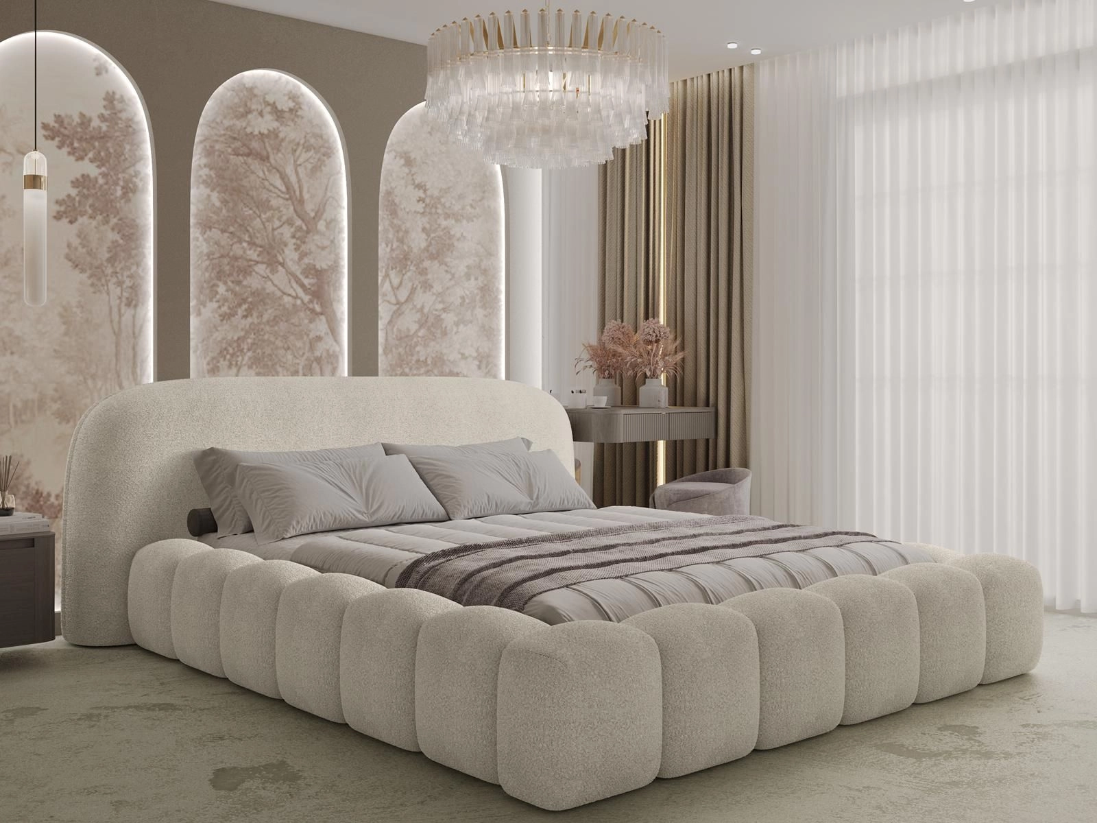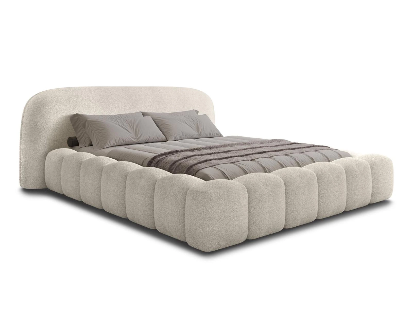 Ekskluzywne beżowe łóżko tapicerowane tkaniną boucle OMBI