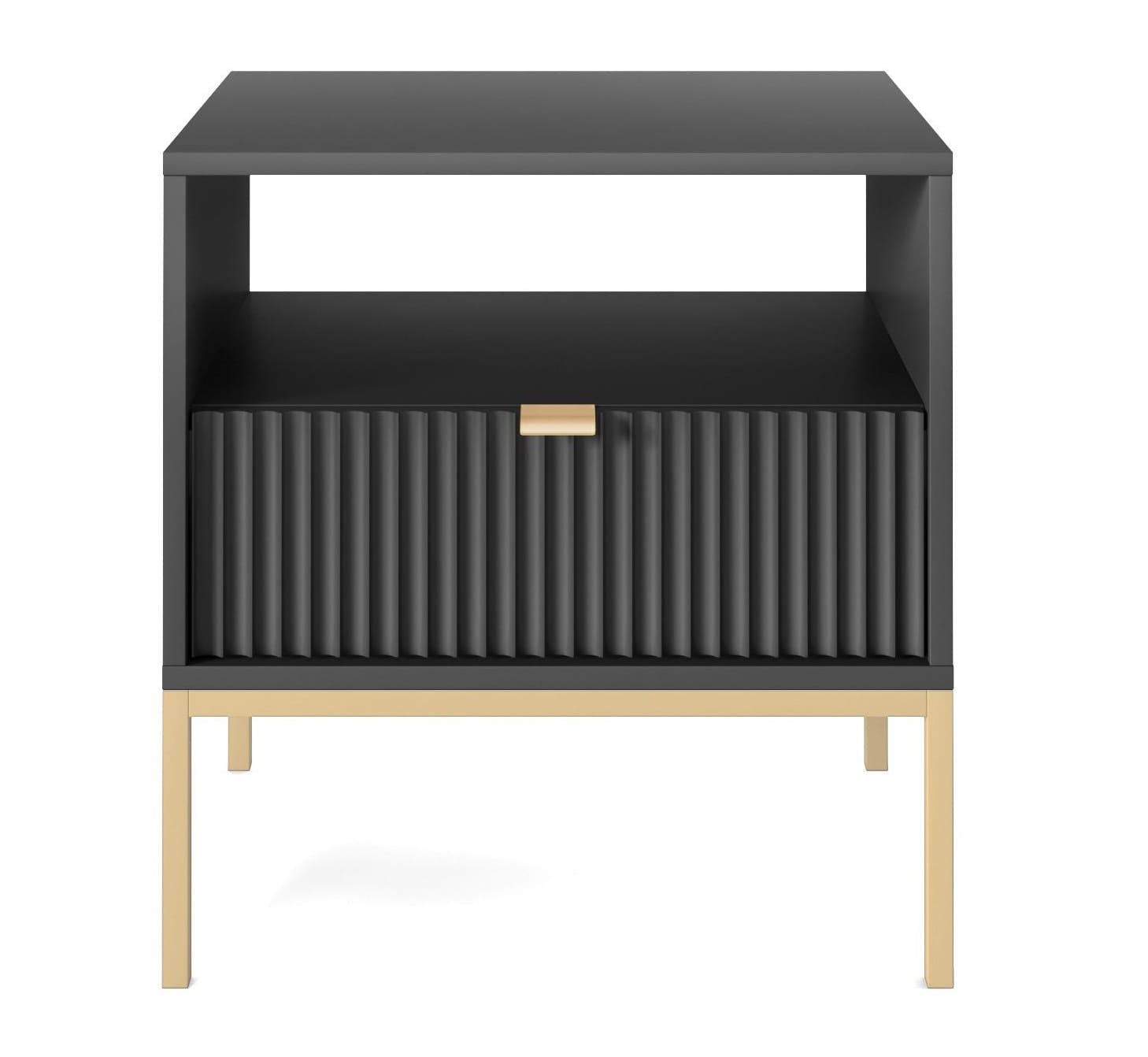 Czarna szafka nocna NANCY to doskonały wybór do każdej sypialni. Ryflowane fronty, będące topowym trendem tego sezonu, nadają meblowi niepowtarzalny wygląd, a złote minimalistyczne uchwyty podkreślają elegancję i luksusowy charakter.