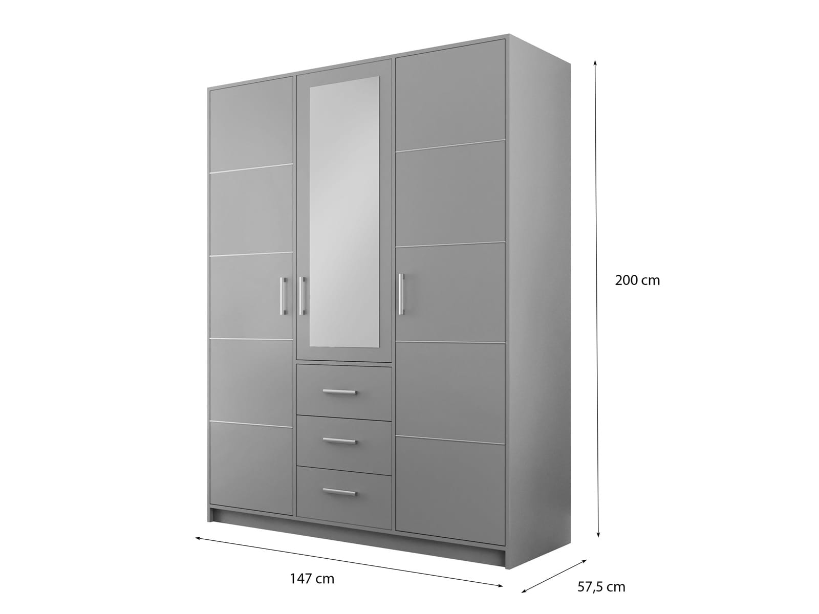 Szafa wyposażona została w 3 drzwi - w tym centralne z lustrem, które optycznie powiększa przestrzeń i dodaje wnętrzu elegancji. To praktyczny dodatek, dzięki któremu można szybko sprawdzić stylizację przed wyjściem. W dolnej części mebla znajdują się 3 pojemne szuflady, idealne na bieliznę, dodatki lub inne drobiazgi.
