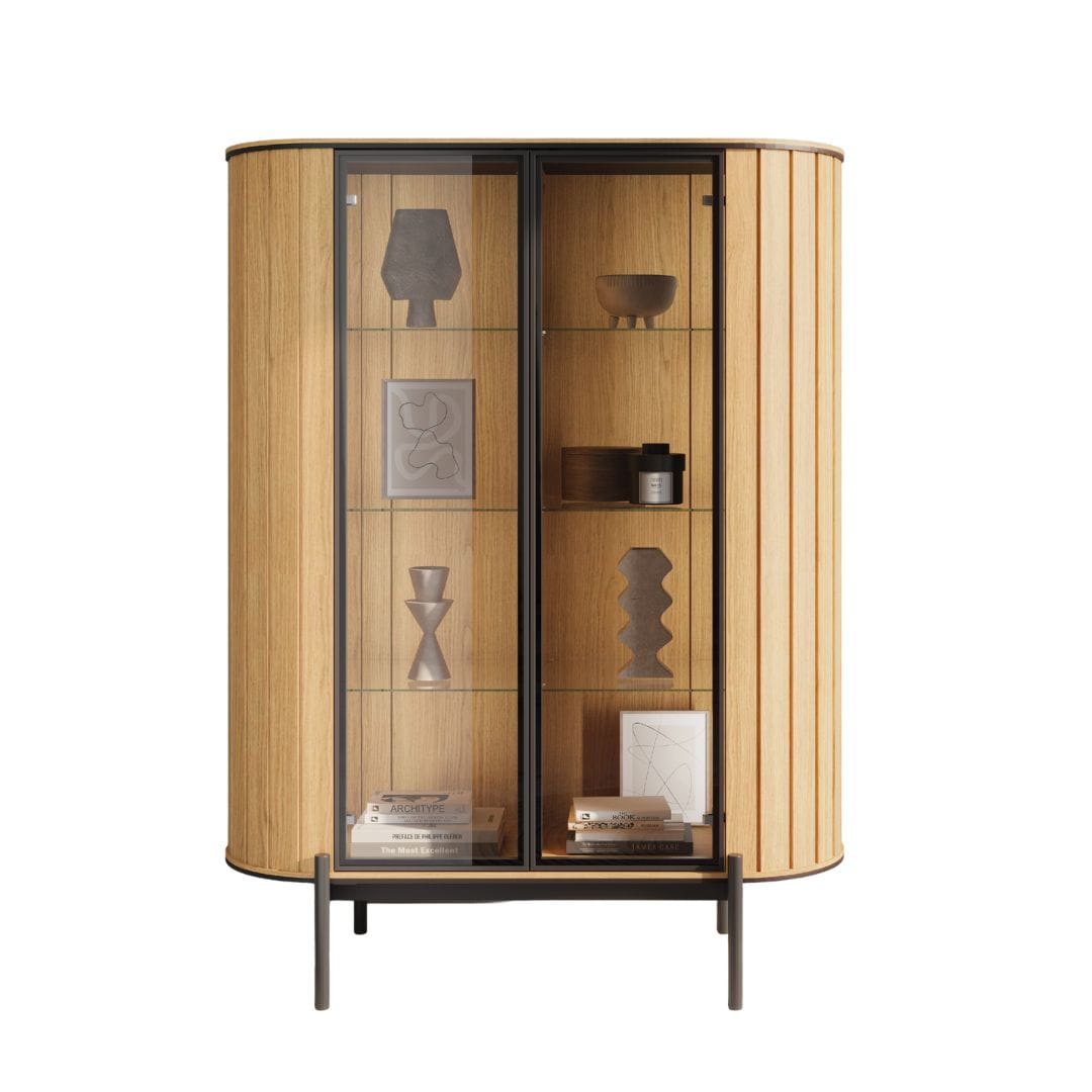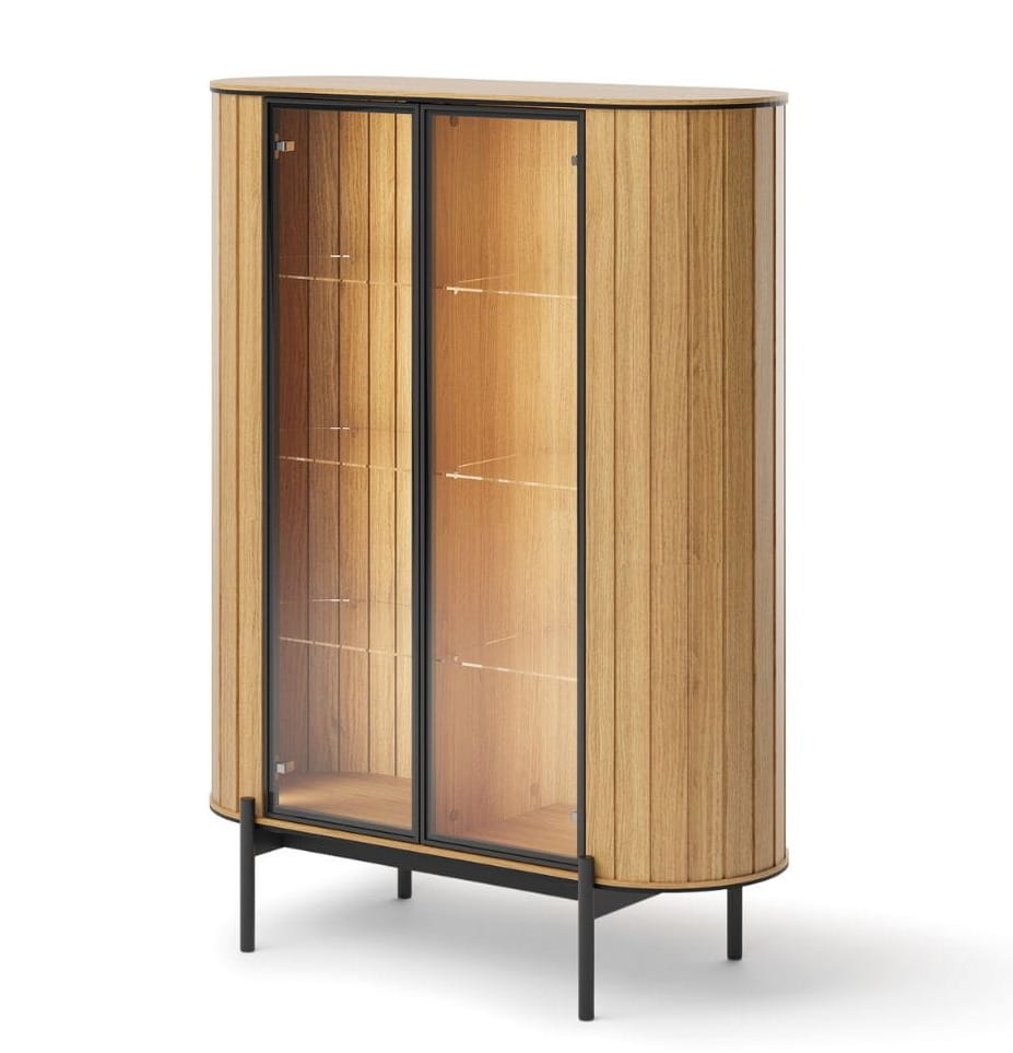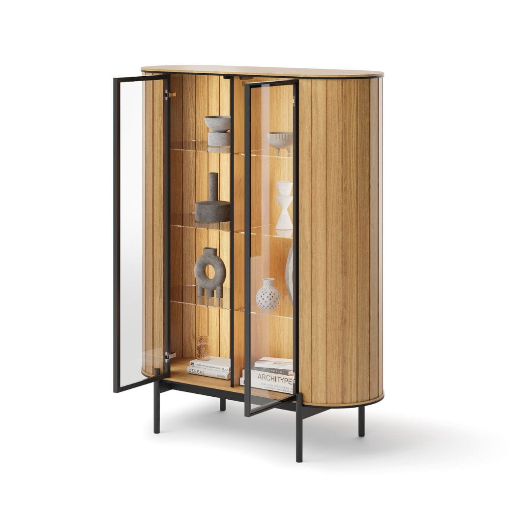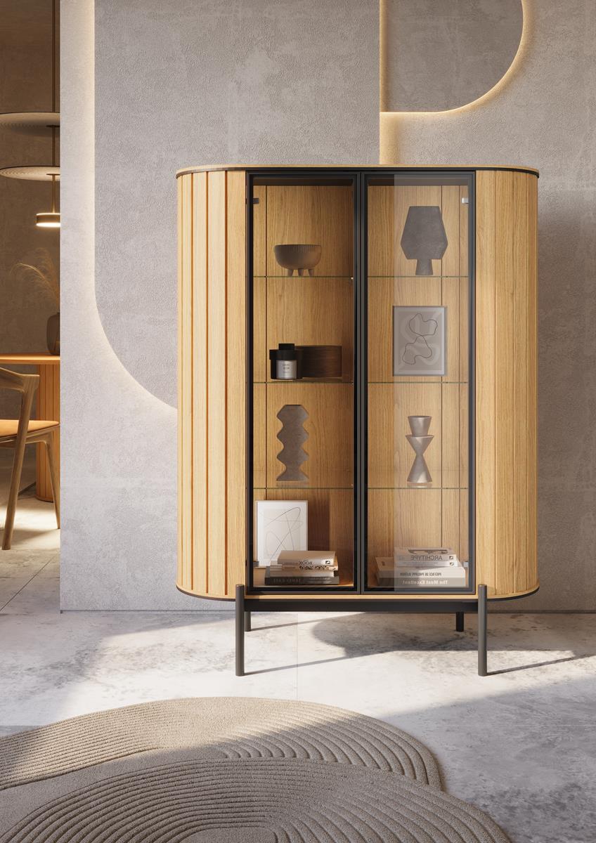 Fronty wykonane z przeszklonych drzwi umożliwiają wyeksponowanie zastawy, szkła, dekoracji czy kolekcji pamiątek, jednocześnie chroniąc je przed kurzem. Wnętrze witryny wyposażone jest w szklane półki oraz oświetlenie LED, które subtelnie podkreśla prezentowane przedmioty i tworzy nastrojową atmosferę w pomieszczeniu.