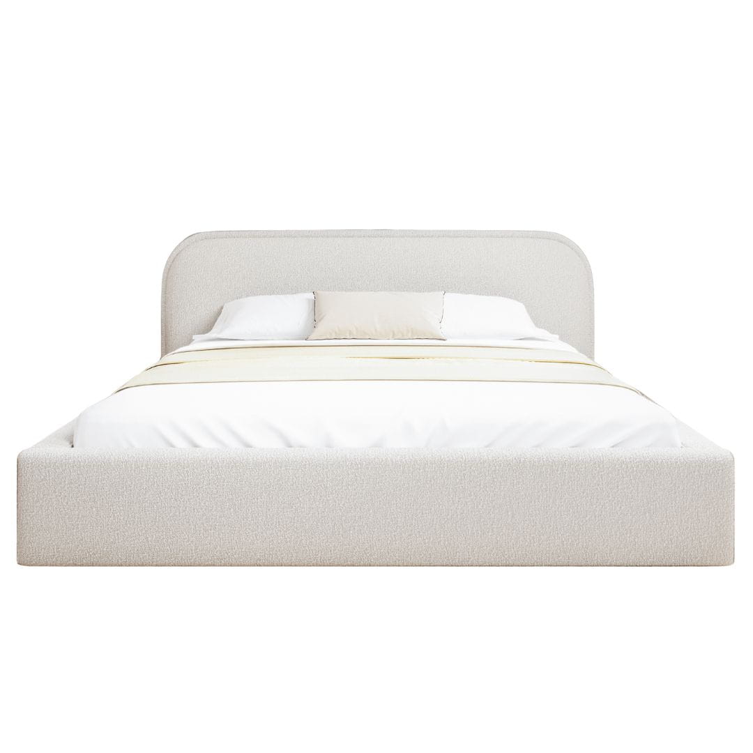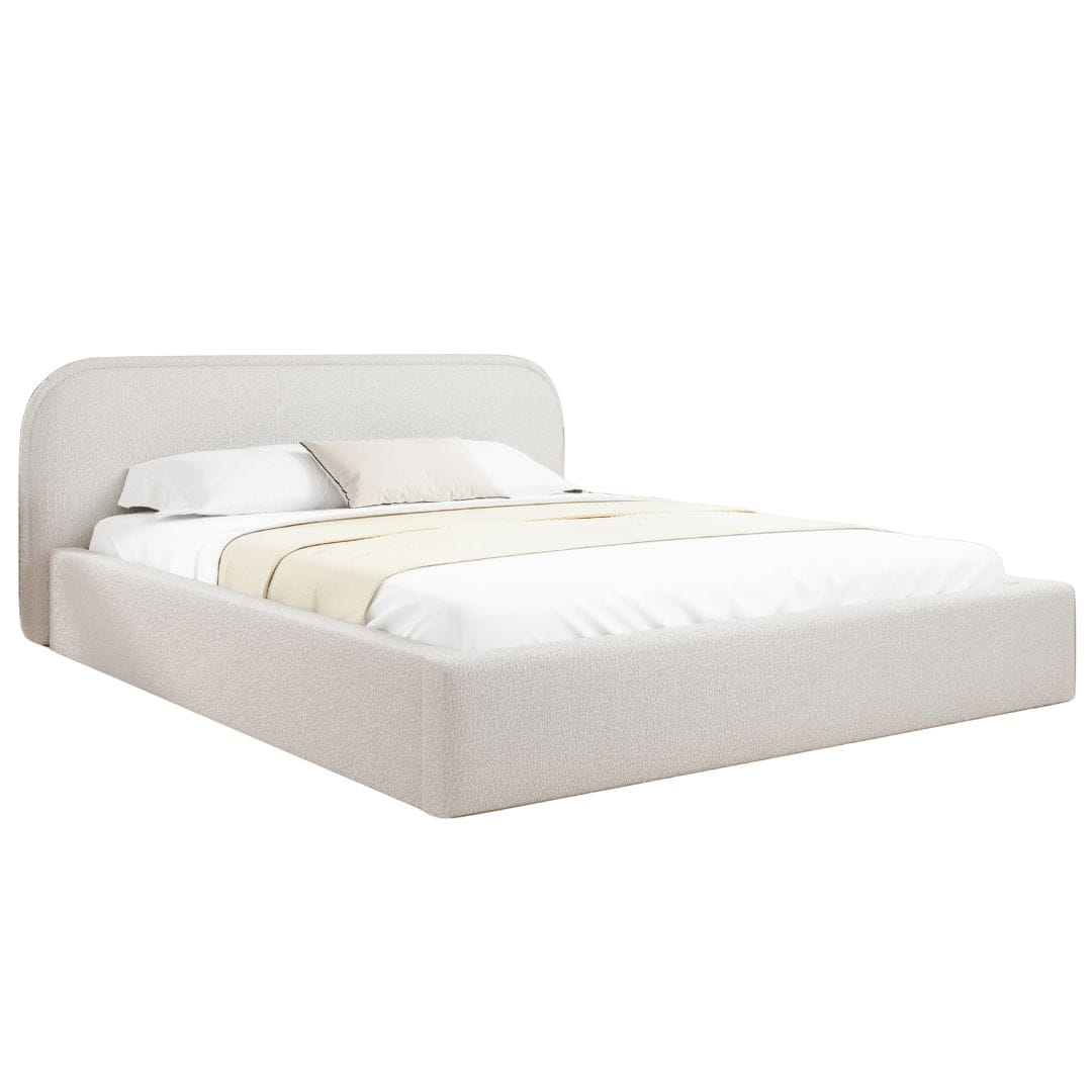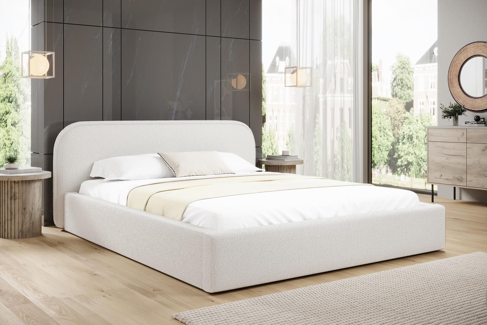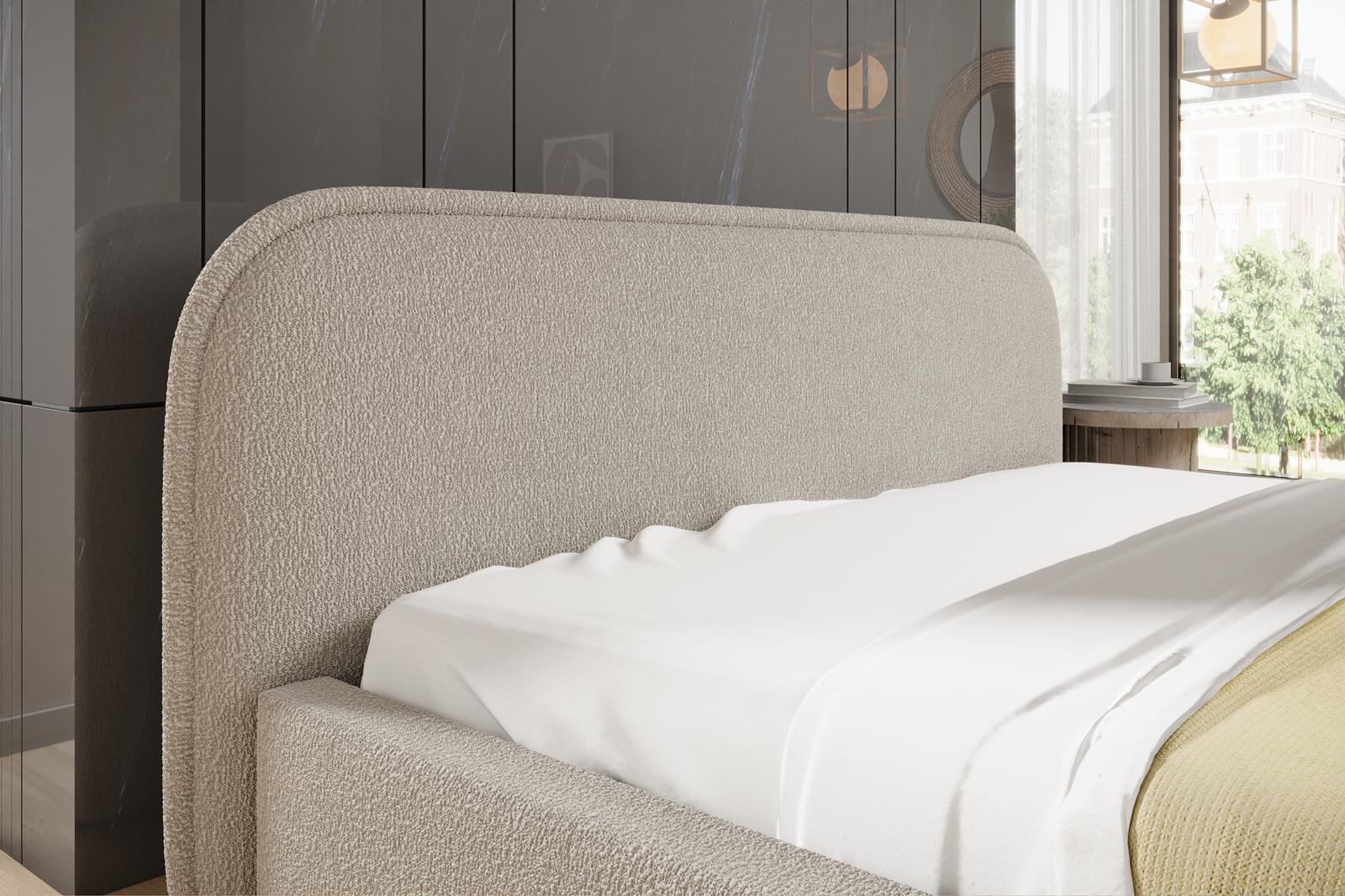 Minimalistyczne łóżko do nowoczesnej sypialni w tkaninie bouclé