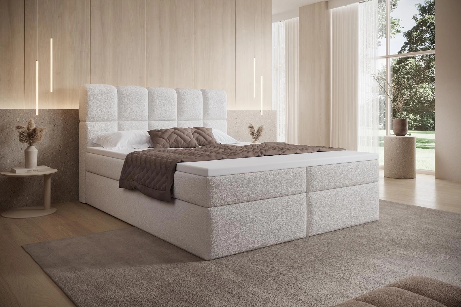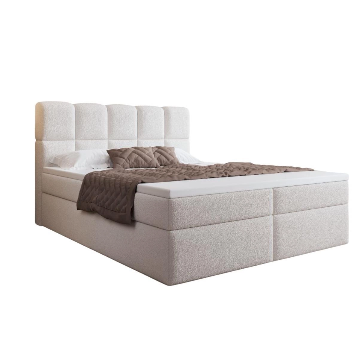 Łóżko wyposażone jest w praktyczne pojemniki na pościel w formie dwóch skrzyń łóżkowych po obu stronach, co czyni je nie tylko stylowym, ale również niezwykle funkcjonalnym rozwiązaniem do sypialni. Elegancki, pikowany zagłówek w nowoczesnym designie dodaje wnętrzu luksusowego charakteru, jednocześnie zapewniając wygodne oparcie podczas czytania czy oglądania telewizji.