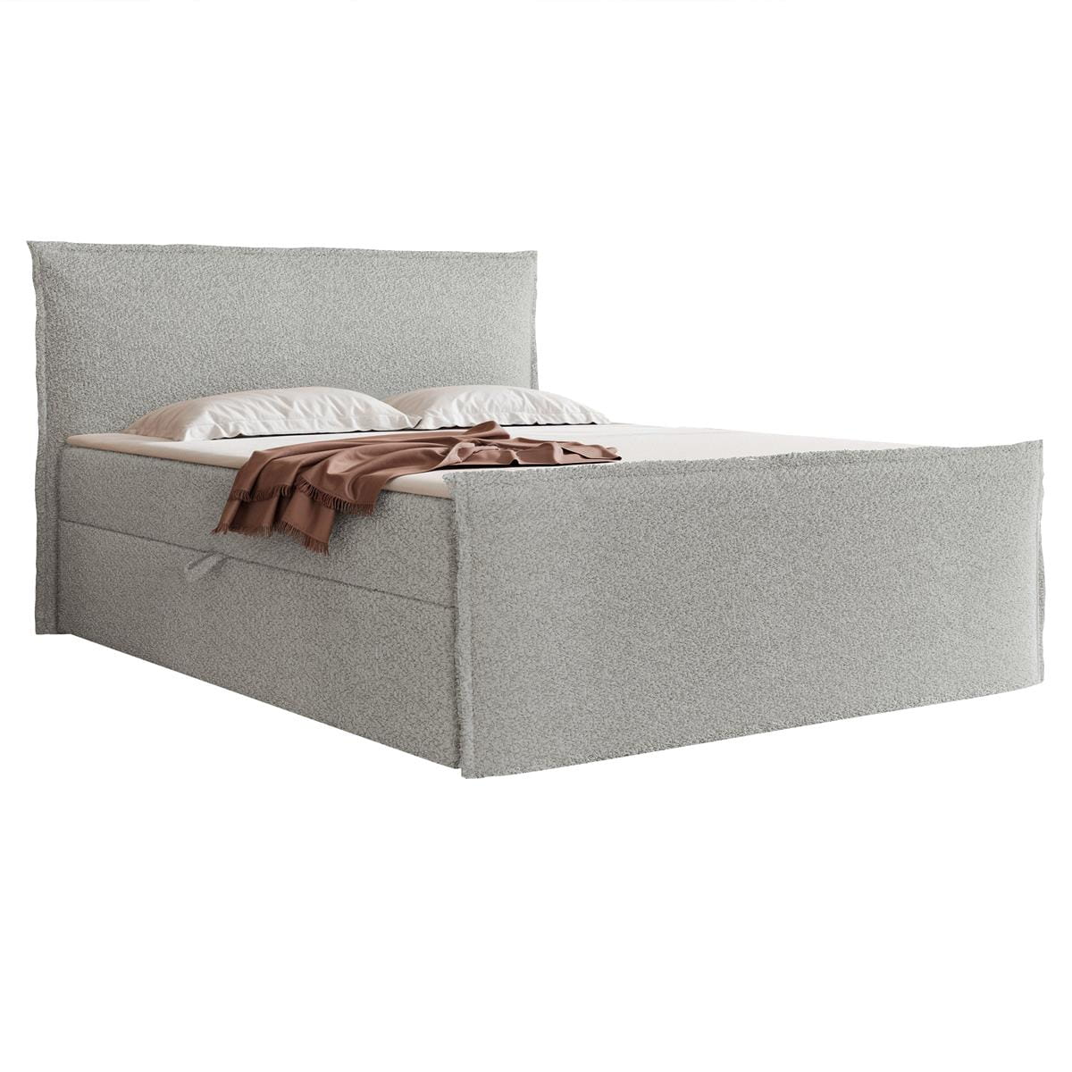 Odkryj wygodę snu i spokojny wygląd sypialni dzięki łóżku kontynentalnemu tapicerowanemu modną szarą tkaniną boucle. To łóżko powstało z myślą o osobach, które chcą solidnego wykonania, dobrego podparcia i stylu wprowadzającego do wnętrza równowagę oraz ciepło. Miękka faktura boucle i łagodne linie zagłówka nadają mu przyjemny, nowoczesny charakter, który pasuje do aranżacji inspirowanych nurtem japandi, boho czy prostą elegancją.