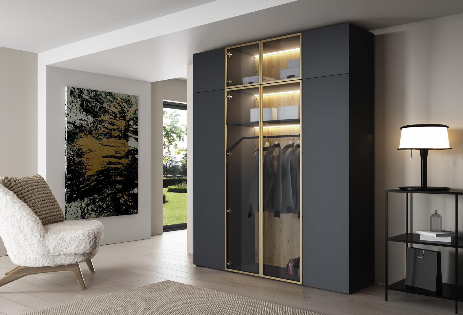 Wewnątrz szafy znajduje się solidny drążek na ubrania, który umożliwia wygodne wieszanie marynarek, sukienek i płaszczy. Liczne półki i schowki pozwalają na przechowywanie ubrań, akcesoriów czy pudełek, a dzięki nadstawce zyskujemy jeszcze więcej miejsca na rzeczy sezonowe lub rzadziej używane. Ponadto elegancki szklany front nadaje wnętrzu nowoczesnego charakteru, a w połączeniu z subtelnym oświetleniem LED pozwala w efektowny sposób wyeksponować garderobę.