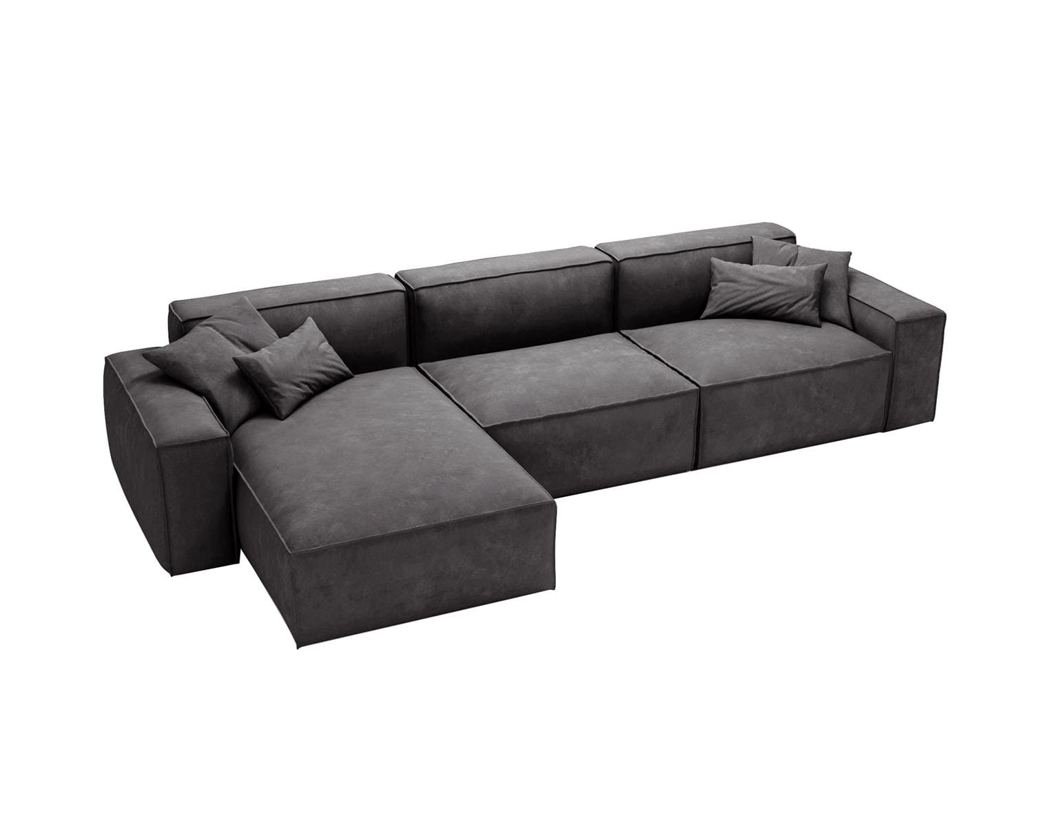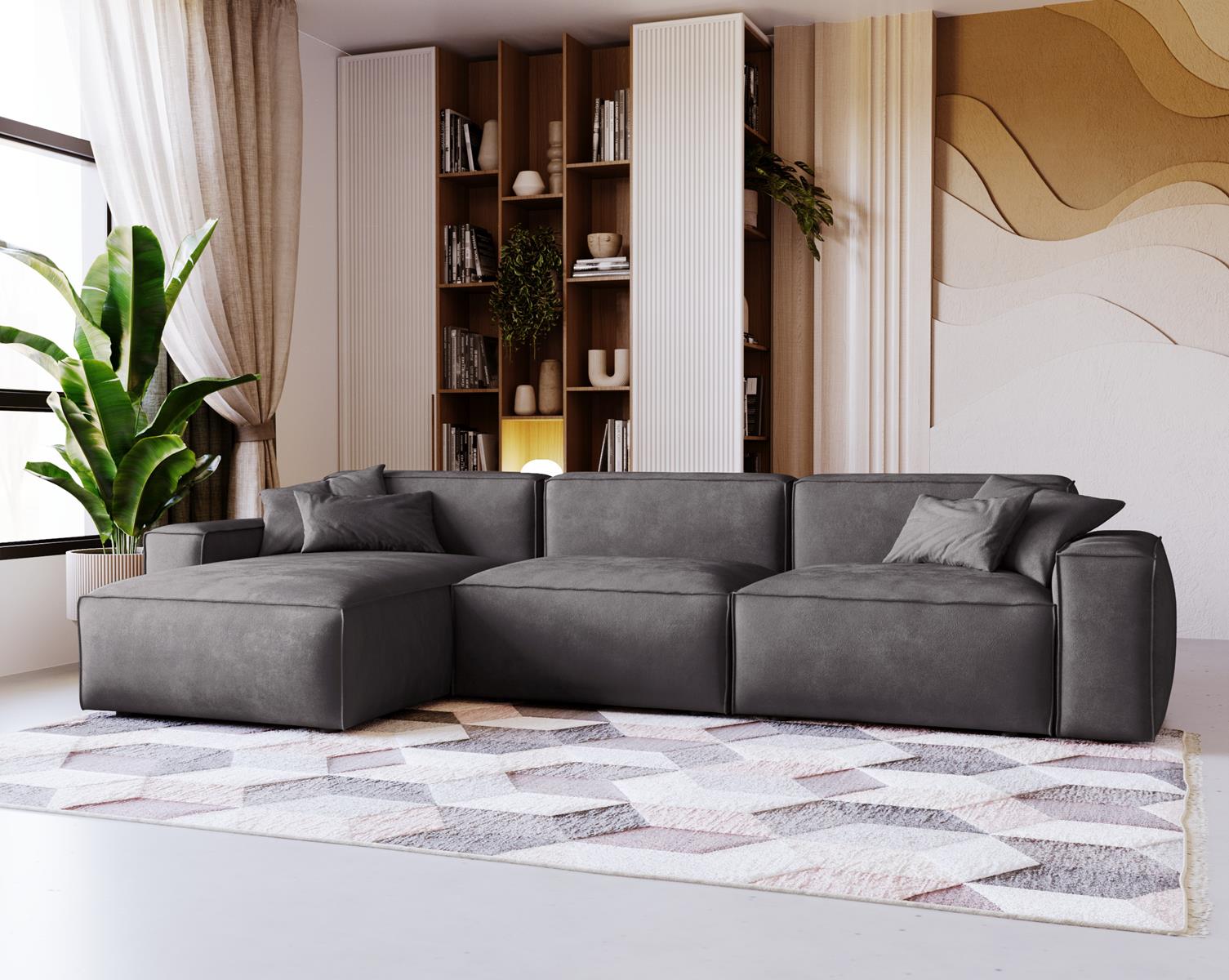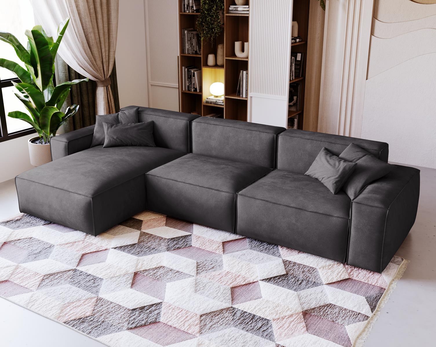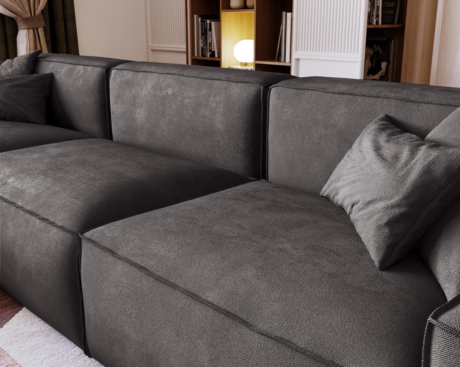 Narożnik w kolorze grafitowym to idealne rozwiązanie dla osób, które poszukują połączenia wyrafinowanego stylu, komfortu i funkcjonalności. Jego subtelne, geometryczne linie w połączeniu z głębokim odcieniem grafitu wprowadzają do wnętrza nutę luksusu oraz ponadczasowej elegancji. Grafit doskonale współgra zarówno z jasnymi, jak i ciemnymi dodatkami, tworząc wyjątkową, przytulną atmosferę w każdym salonie.