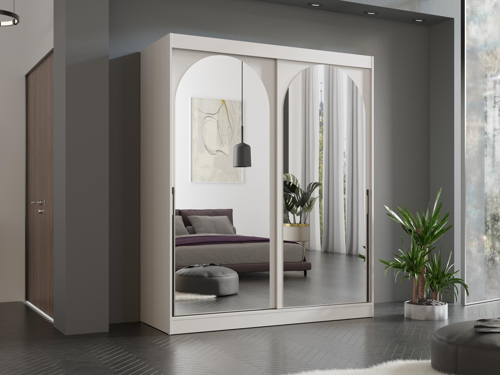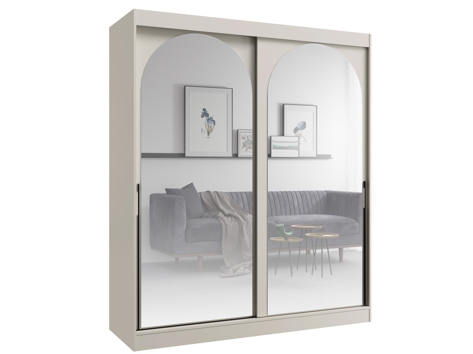 Elegancka i funkcjonalna szafa przesuwna z lustrem o szerokości 180 cm to idealne rozwiązanie do nowoczesnych wnętrz. Kaszmirowa kolorystyka w połączeniu z dużymi lustrzanymi drzwiami w kształcie łuku nadaje pomieszczeniu stylowy i nowoczesny charakter, jednocześnie optycznie powiększając przestrzeń. Szafa z drzwiami przesuwnymi sprawdzi się doskonale w sypialni, garderobie oraz przedpokoju, gdzie liczy się każdy centymetr wolnego miejsca.