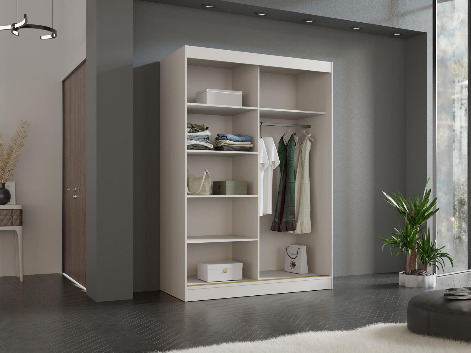 Wnętrze szafy zostało zaprojektowane z myślą o maksymalnej funkcjonalności - praktyczne półki i przestrzeń na wieszaki pozwalają na wygodne przechowywanie ubrań, dodatków i innych przedmiotów codziennego użytku. System drzwi przesuwnych działa płynnie i cicho, zapewniając komfortowe użytkowanie.
