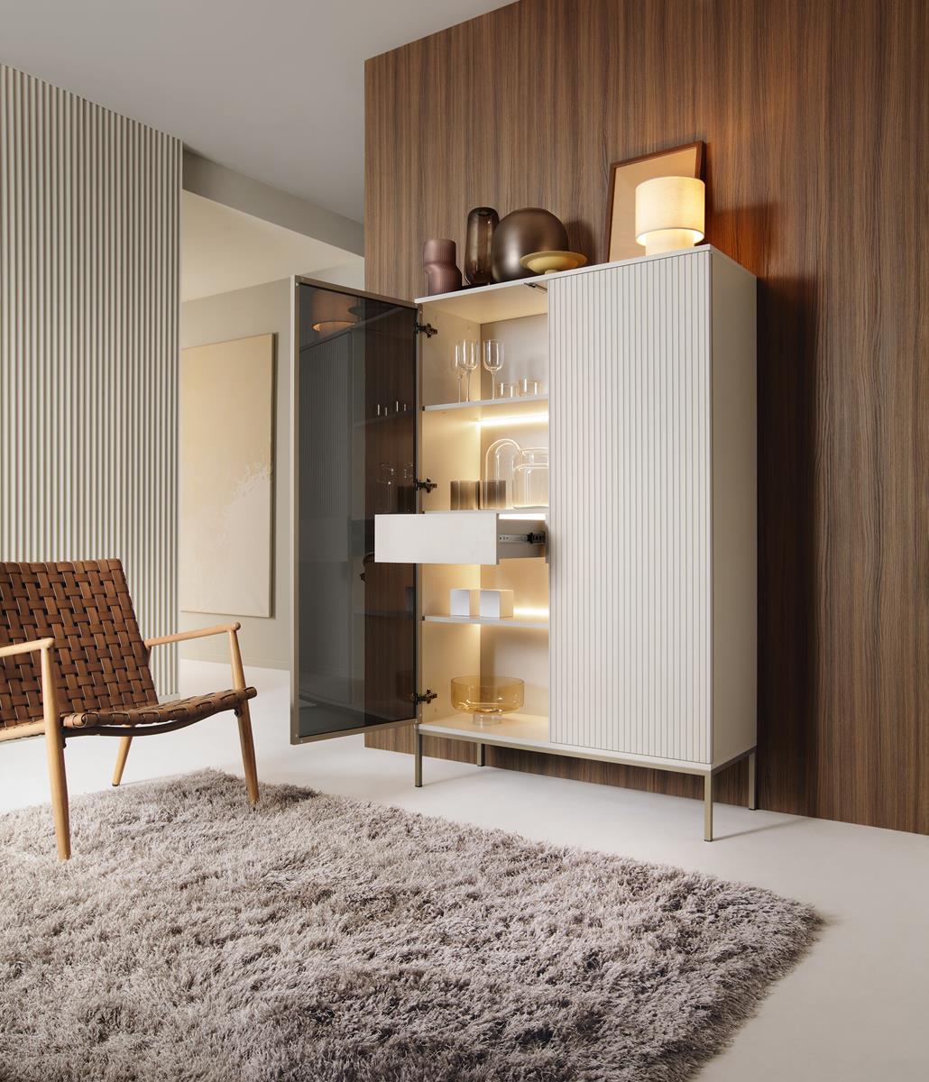 Kaszmirowa witryna LINO z ryflowanym frontem to doskonałe połączenie nowoczesnego designu, elegancji i funkcjonalności. Ten stylowy mebel wyróżnia się subtelnym kaszmirowym kolorem, który wprowadza do wnętrza ciepło i klasę, a charakterystyczny ryflowany front dodaje całości wyjątkowego, dekoracyjnego charakteru.