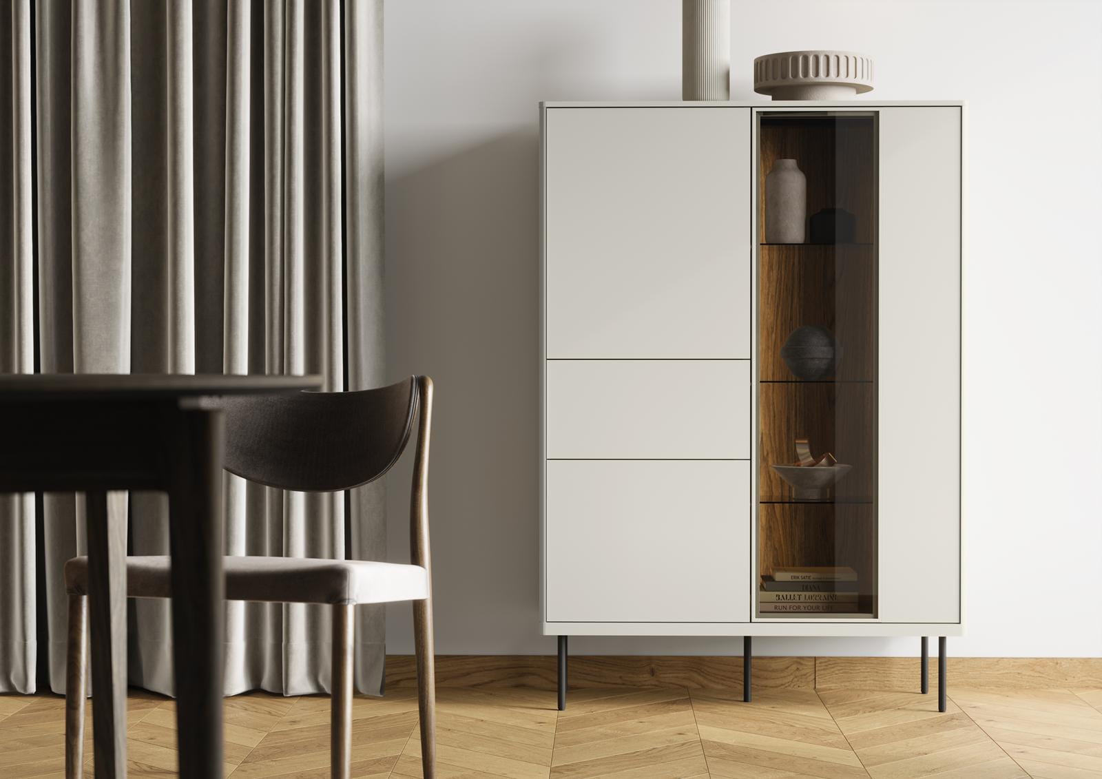 Kaszmirowa kolorystyka sprawia, że witryna świetnie wpisuje się w nowoczesne i eleganckie wnętrza, dodając im lekkości i luksusowego charakteru. Solidne wykonanie z płyty laminowanej gwarantuje trwałość i odporność na codzienne użytkowanie.
