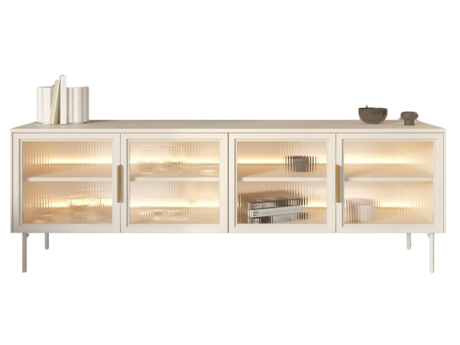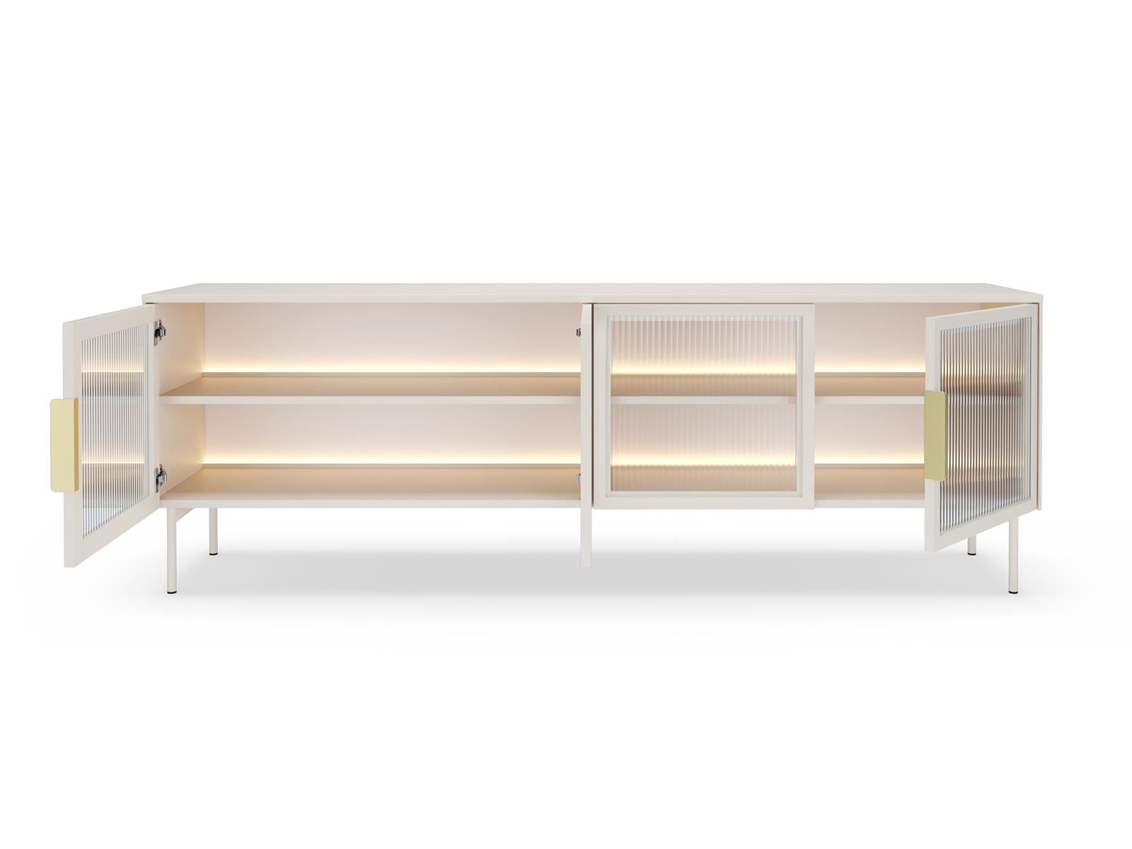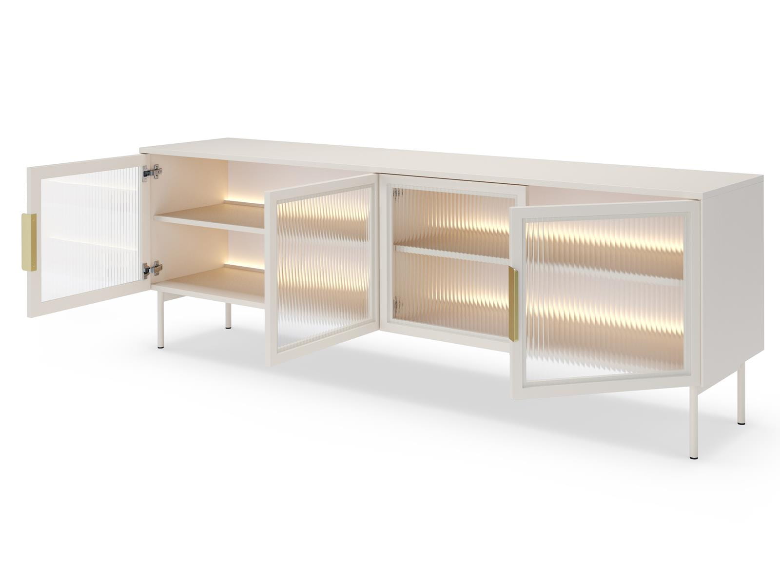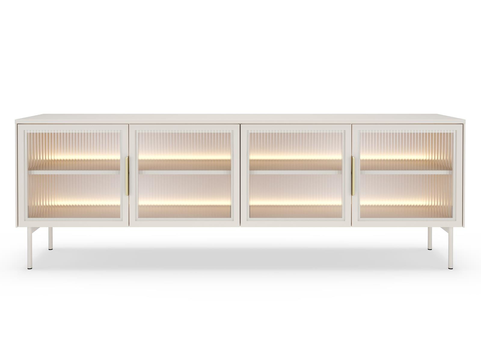 Ryflowane fronty z hartowanego szkła ESG w ramie MDF zachwycają swoją strukturą, a przeszklony środkowy front wprowadza do wnętrza lekkość i subtelną nutę luksusu. Całość dopełnia ciepły, kaszmirowy kolor, który pięknie współgra z nowoczesnymi i klasycznymi aranżacjami.