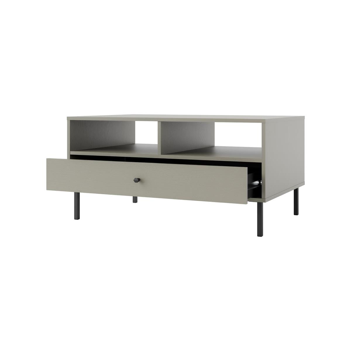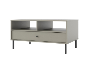 Stolik kawowy w kolorze eukaliptus z otwartą półką i szufladą to połączenie świeżego, nowoczesnego designu z funkcjonalnością, idealny do każdego salonu. Jego zgaszony, zielony odcień wprowadza do wnętrza spokój i przytulność, nadając przestrzeni naturalnego charakteru. Czarne kontrastowe detale dodają stolikowi elegancji i nowoczesnego akcentu.
