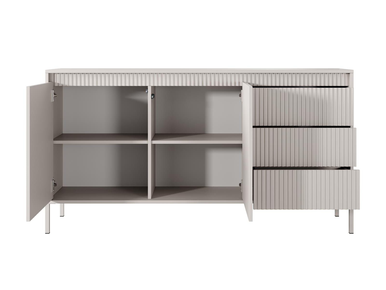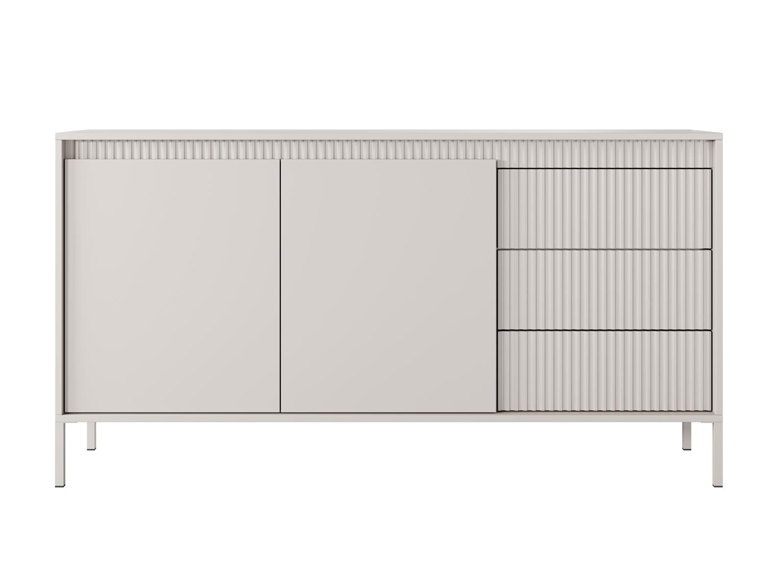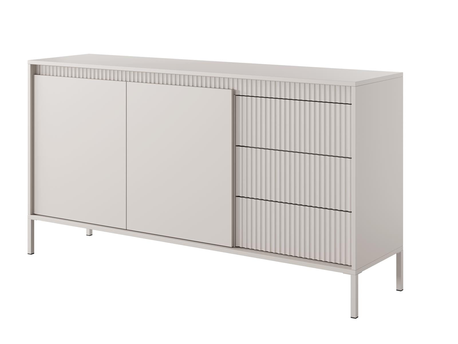 Charakterystycznym elementem komody są dekoracyjne, ryflowane fronty, które nadają jej wyjątkowego stylu i elegancji. Delikatna, pionowa struktura przełamuje prostotę formy, dodając meblowi głębi i wyrafinowanego charakteru. To detal, który przyciąga uwagę, a jednocześnie pozostaje spójny z minimalistycznym designem.